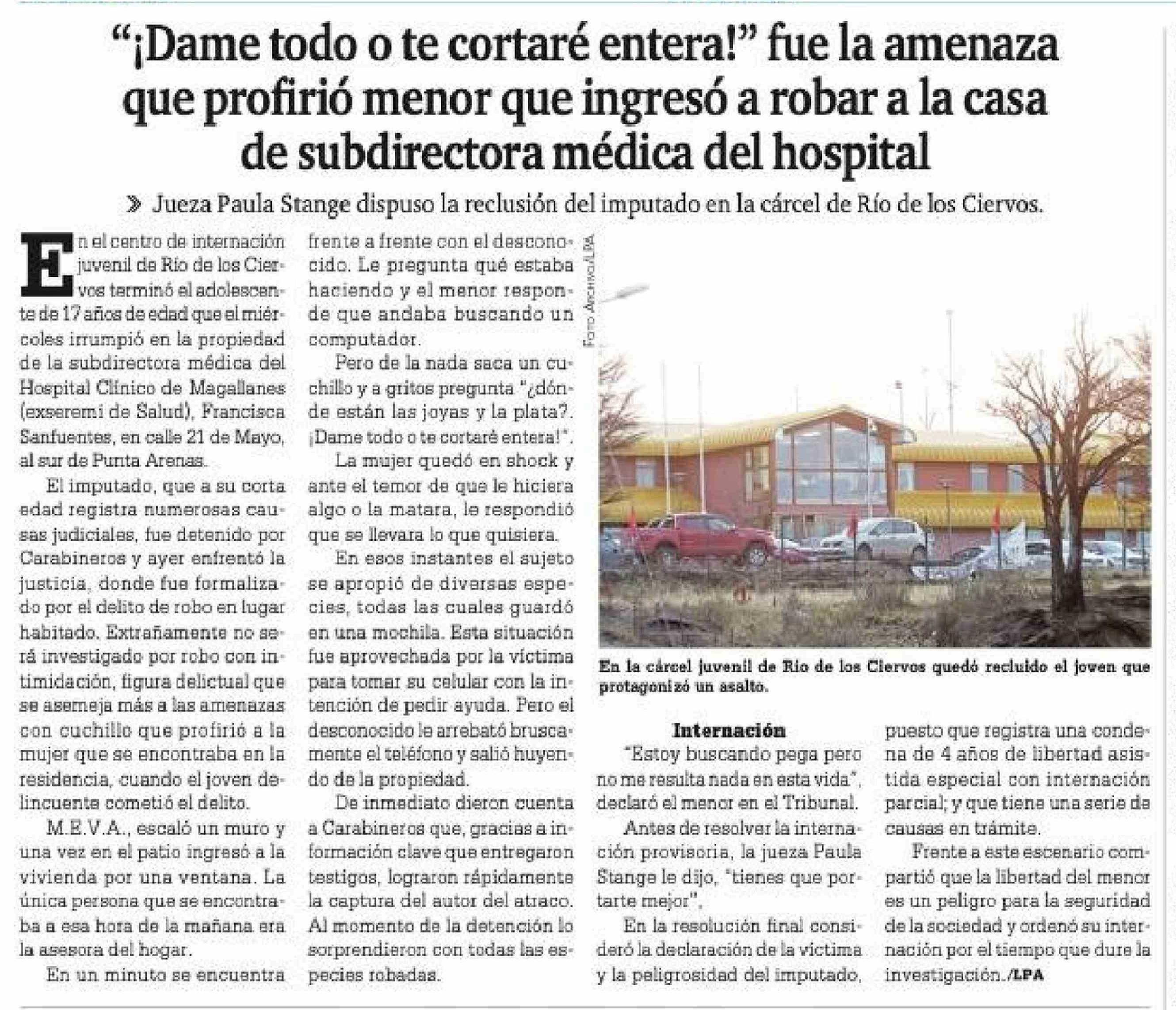 | Título: | "¡Dame todo o te cortaré entera!" fue la amenaza que profirió menor que ingresó a robar a la casa de subdirectora médica del hospital |