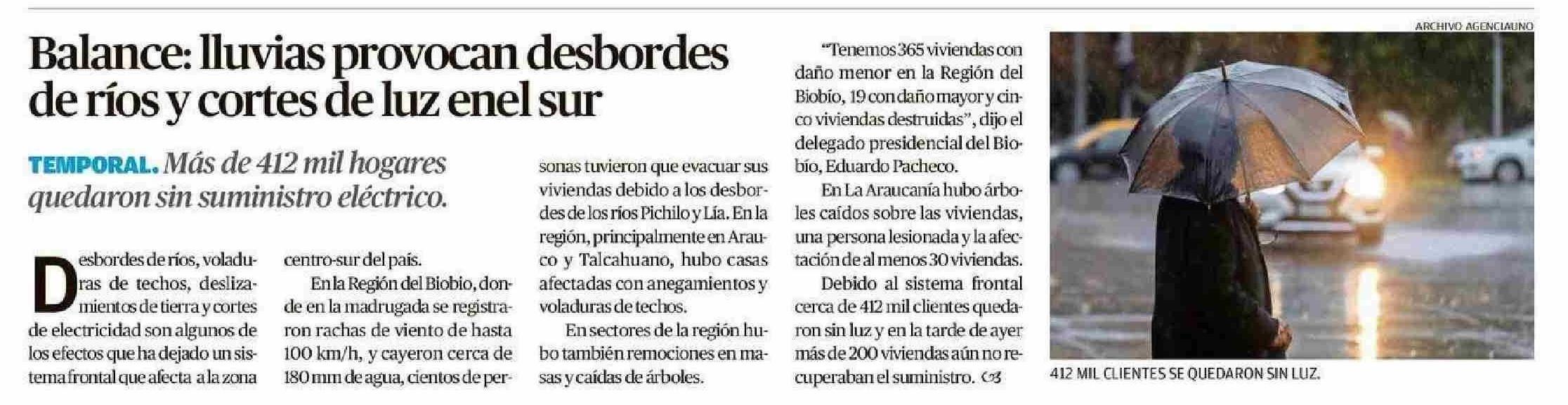 Balance: lluvias provocan desbordes de ríos y cortes de luz enel sur