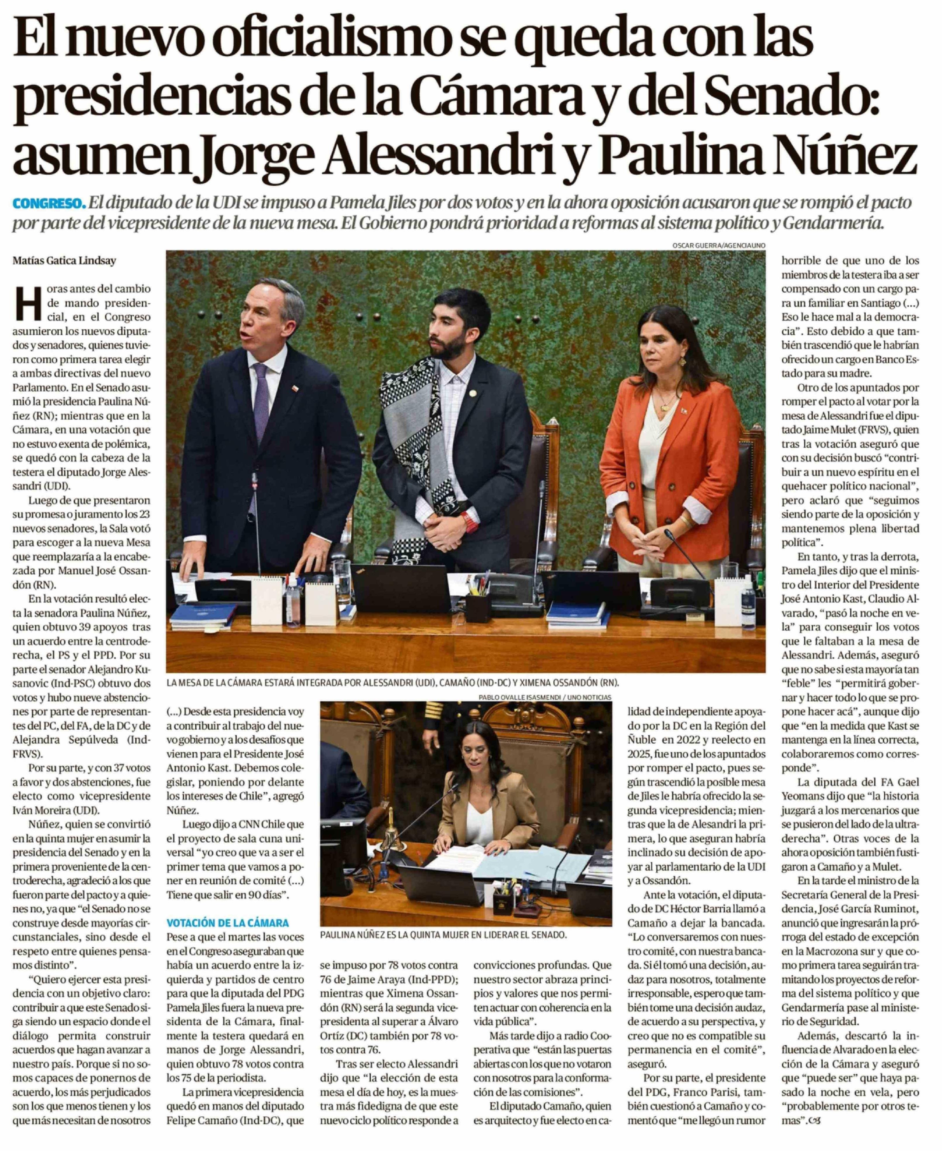 El nuevo oficialismo se queda con las presidencias de la Cámara y del Senado: asumen Jorge Alessandri y Paulina Núñez