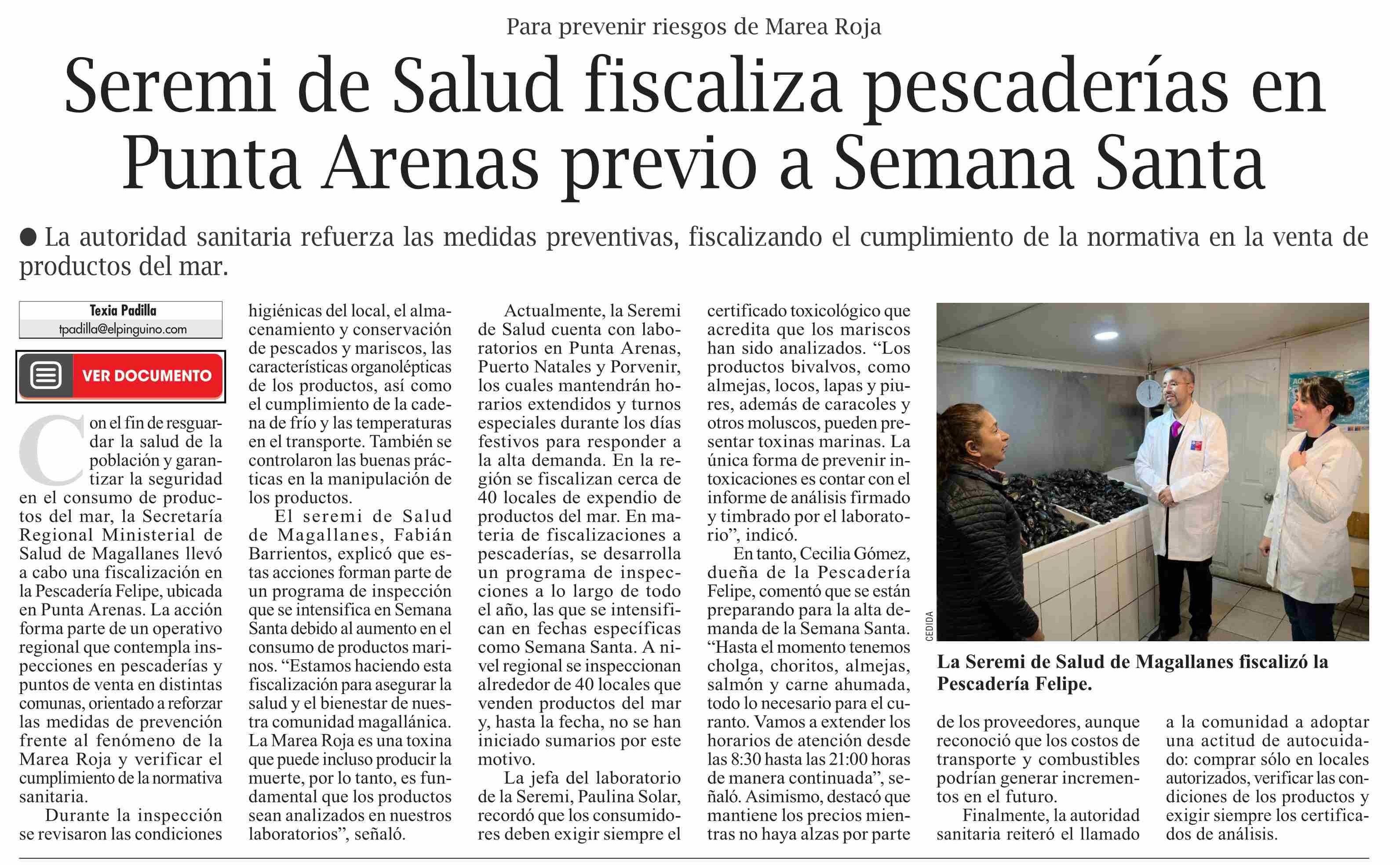 Seremi de Salud fiscaliza pescaderías en Punta Arenas previo a Semana Santa