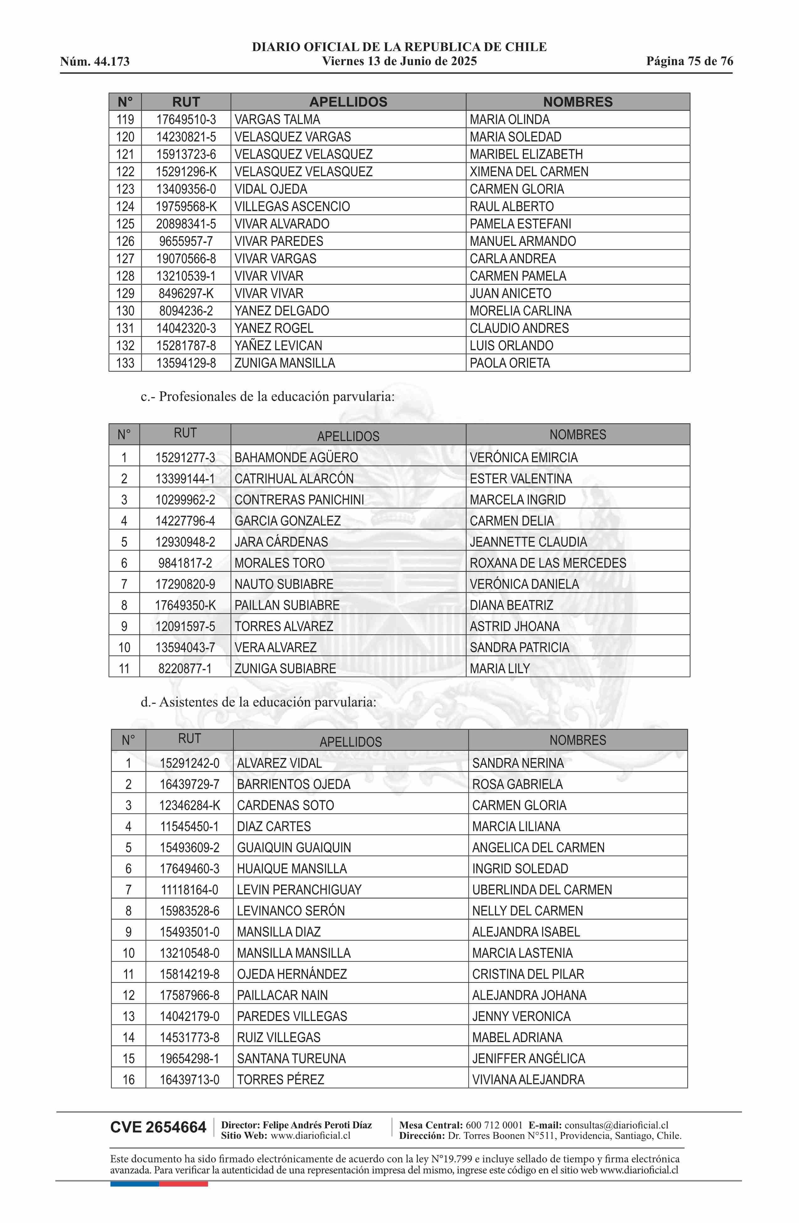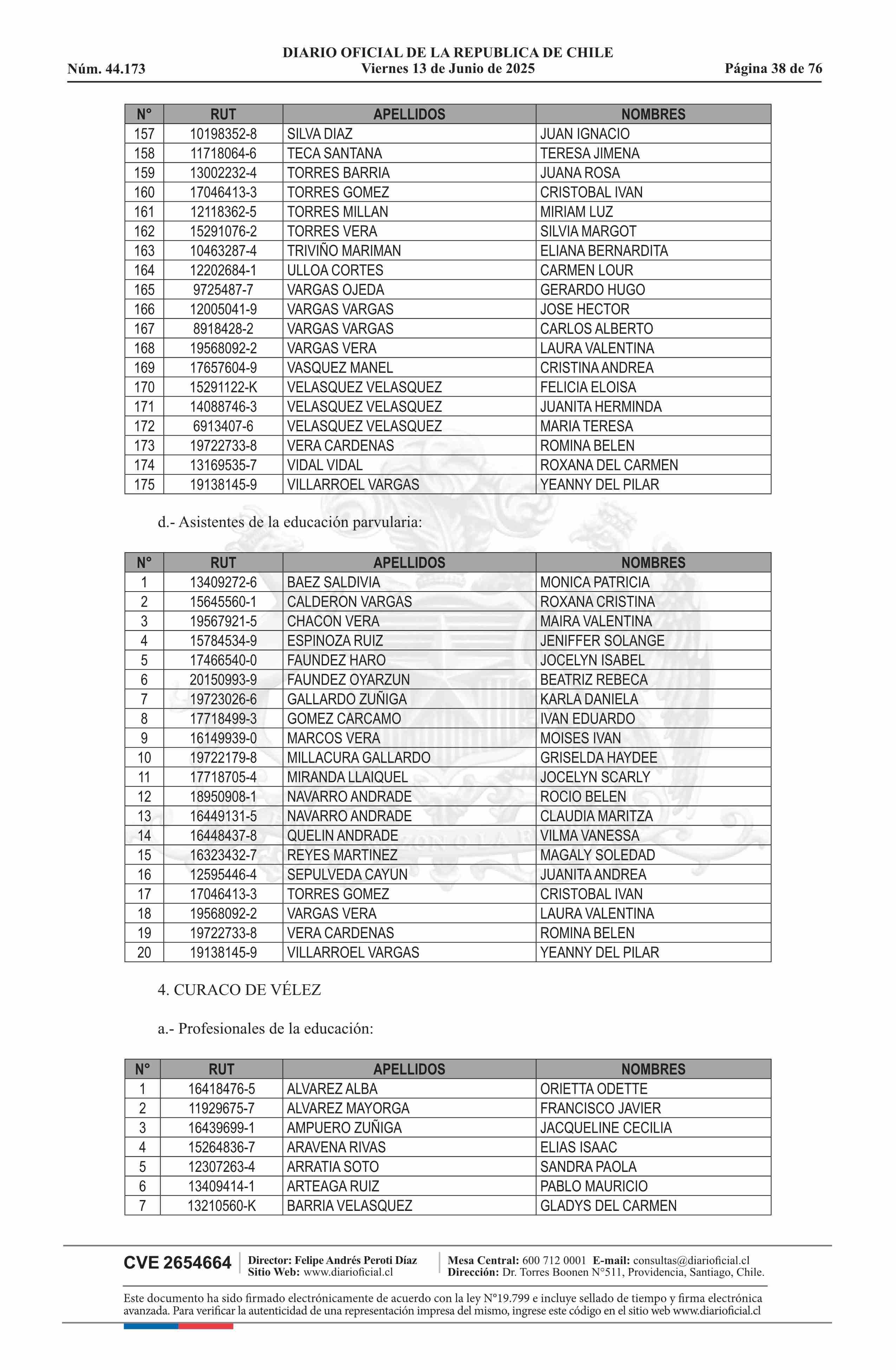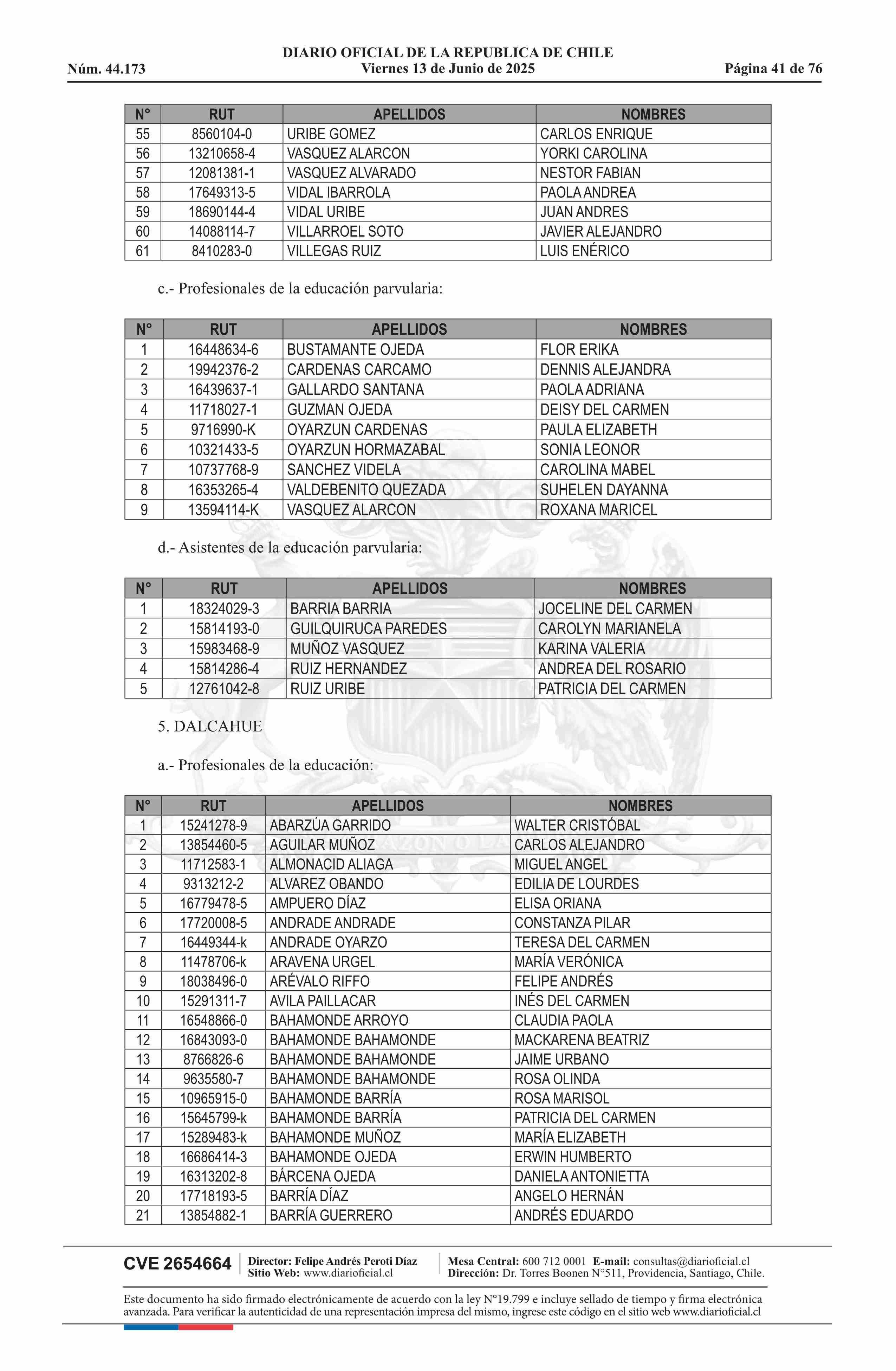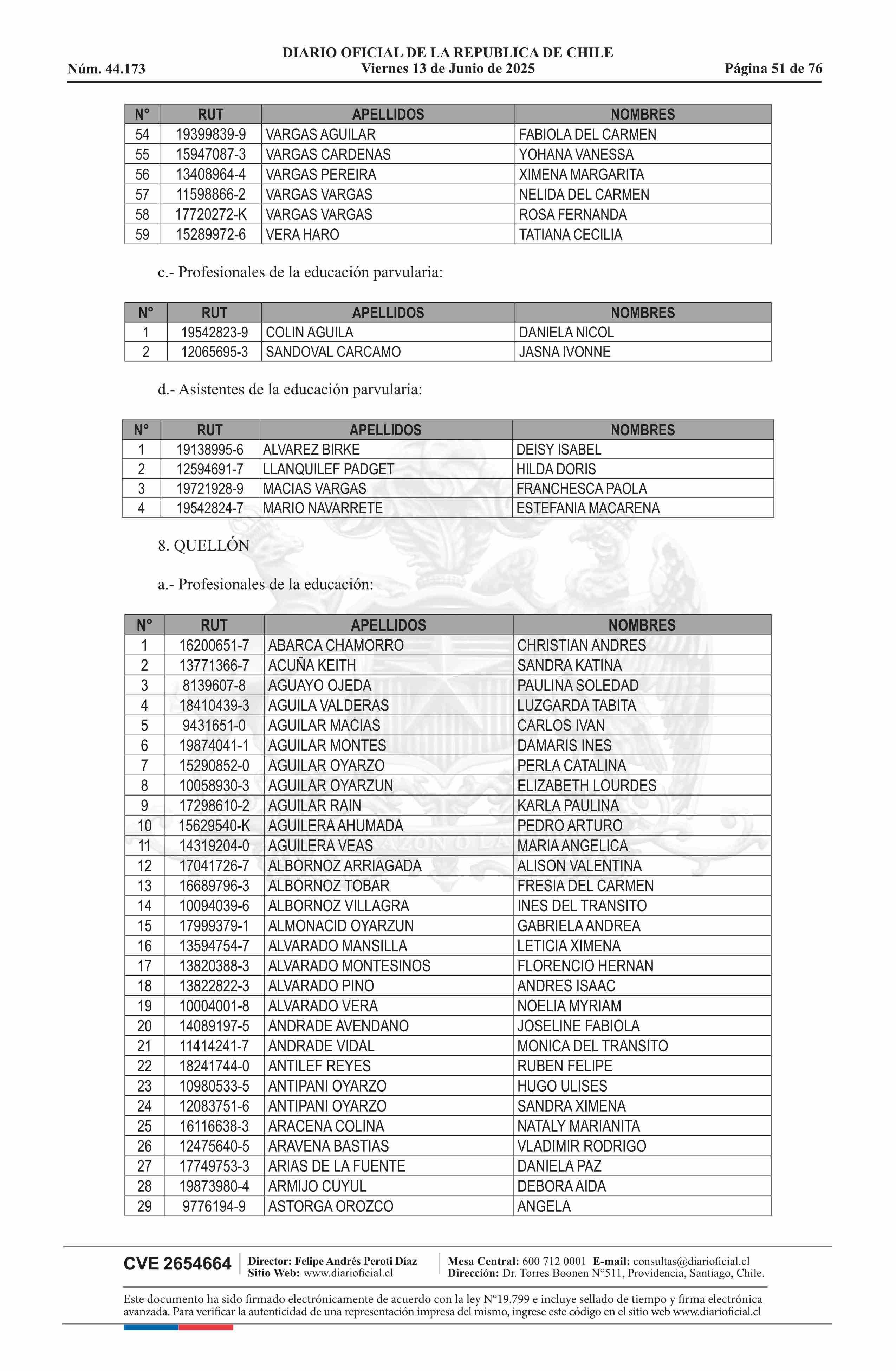 | Título: | Decreto exento número 382, de 2025.- Individualiza a profesionales de la educación y asistentes de la educación que se desempeñan en los establecimientos educacionales de dependencia de las municipalidades de Castro, Ancud, Chonchi, Curaco de Vélez, Dalcahue, Puqueldón, Queilén, Quellón, Quemchi y Q |