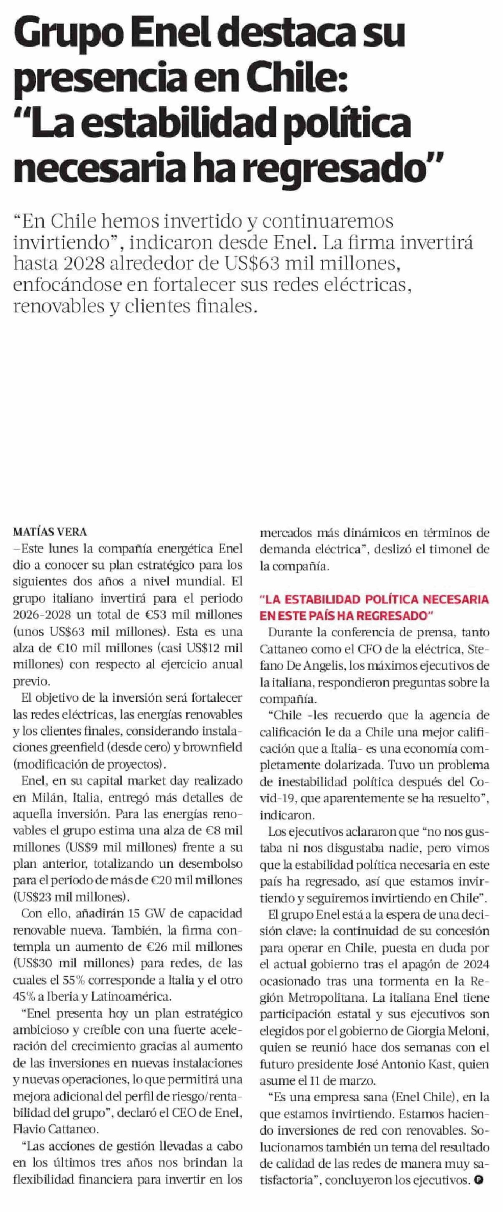 Grupo Enel destaca su presencia en Chile: "La estabilidad política necesaria ha regresado"