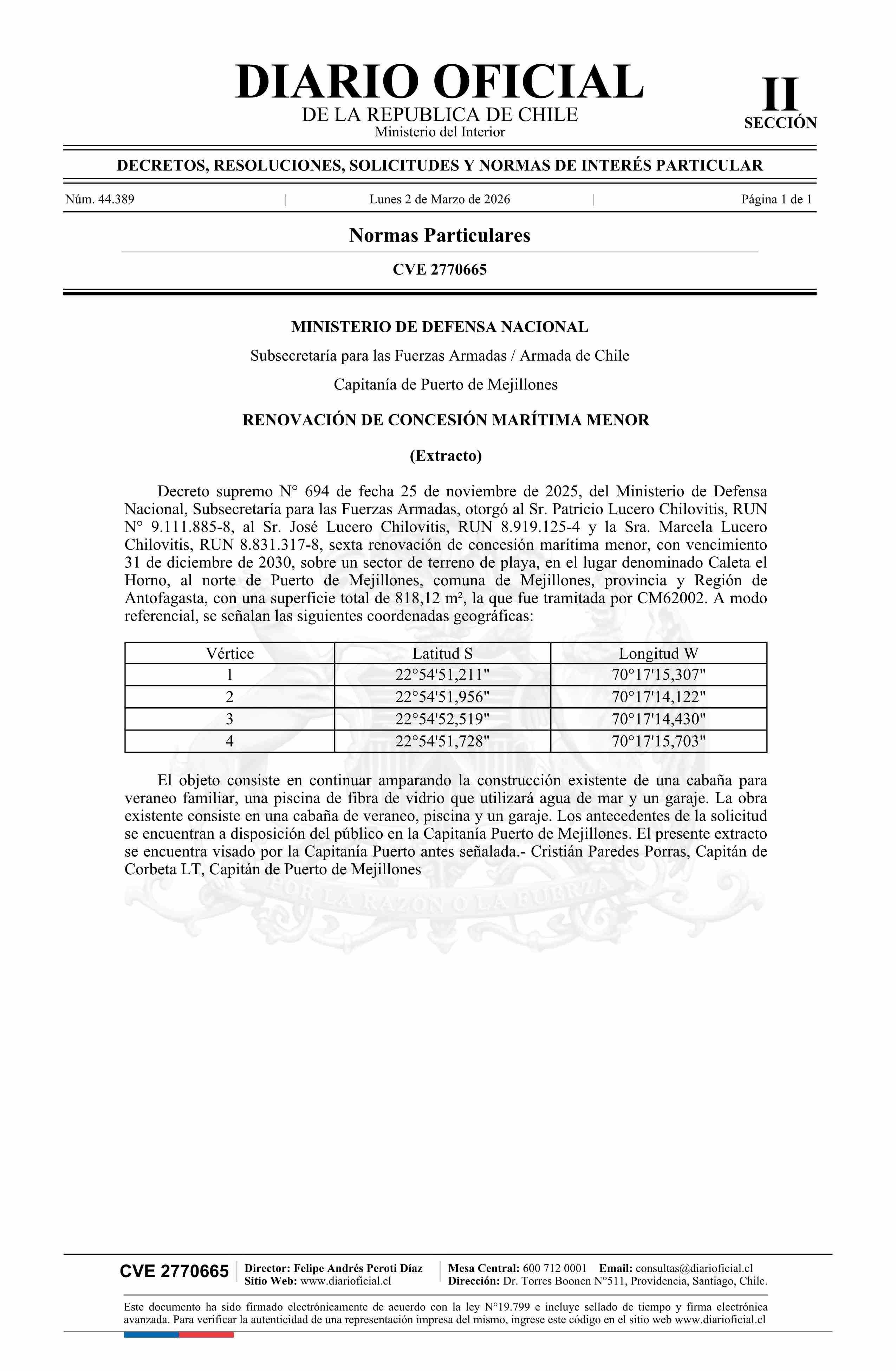| Título: | Extracto de decreto número 694, de 2025.- Renovación de concesión marítima menor??????? |