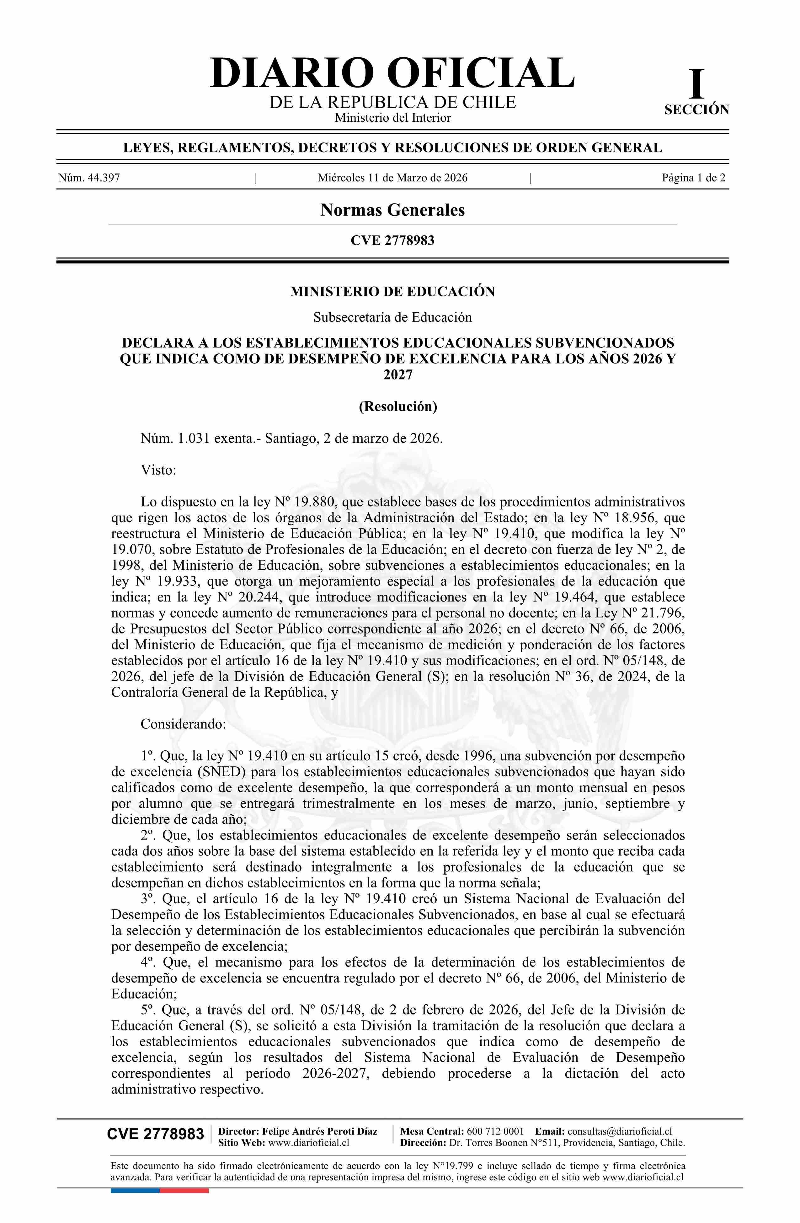 | Título: | Resolución exenta número 1.031, de 2026.- Declara a los establecimientos educacionales subvencionados que indica como de desempeño de excelencia para los años 2026 y 2027 |