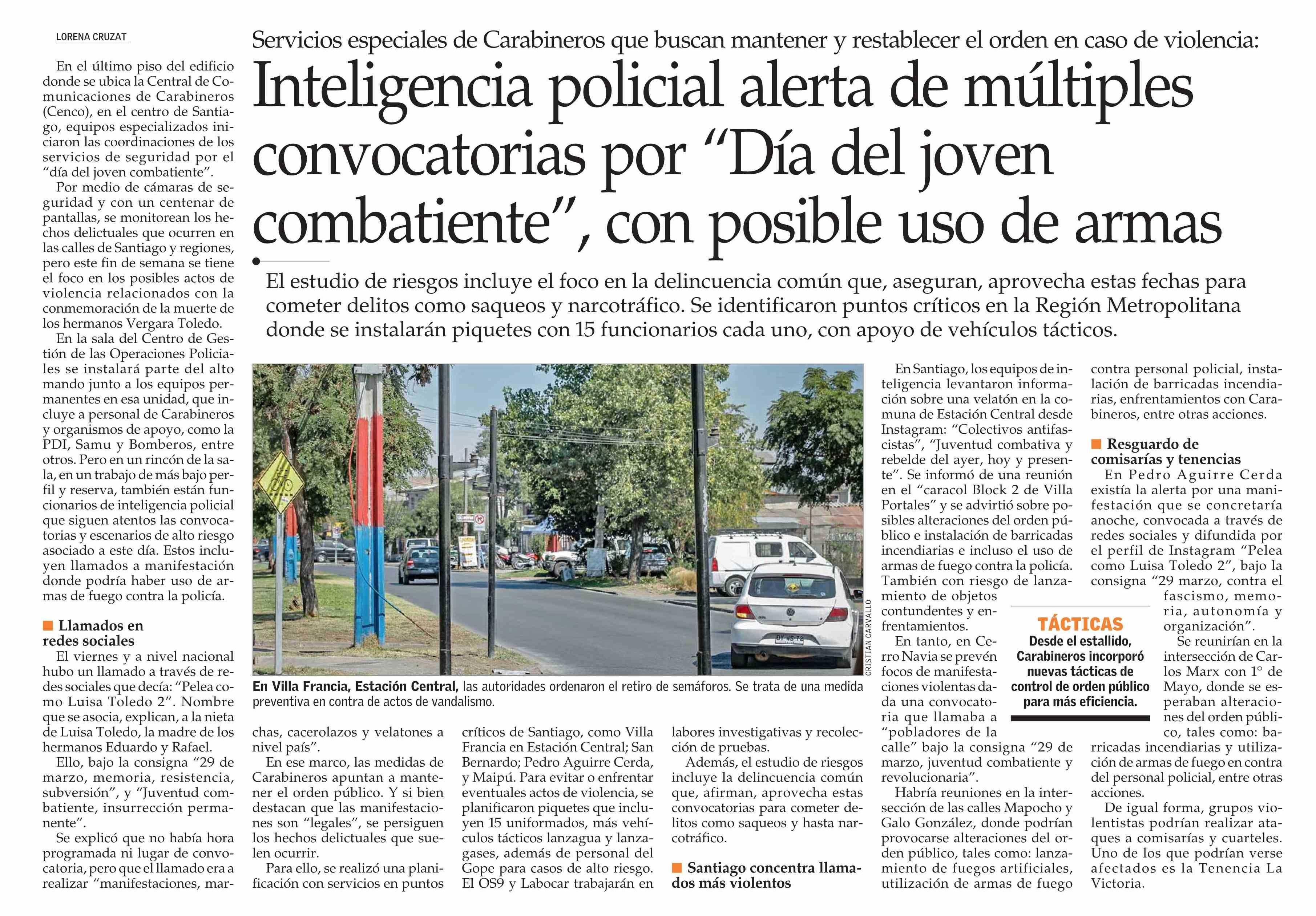 Inteligencia policial alerta de múltiples convocatorias por “Día del joven combatiente”, con posible uso de armas