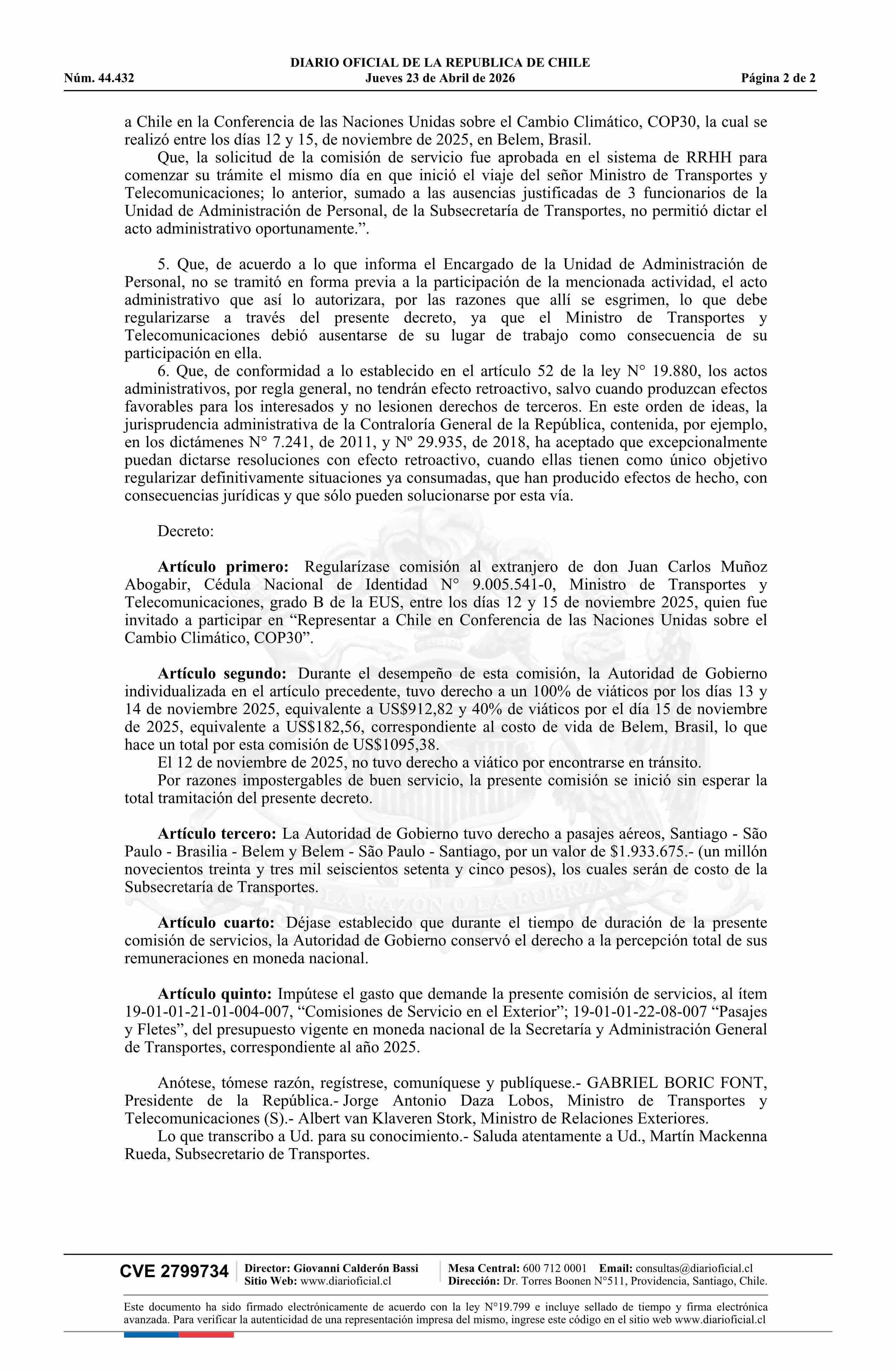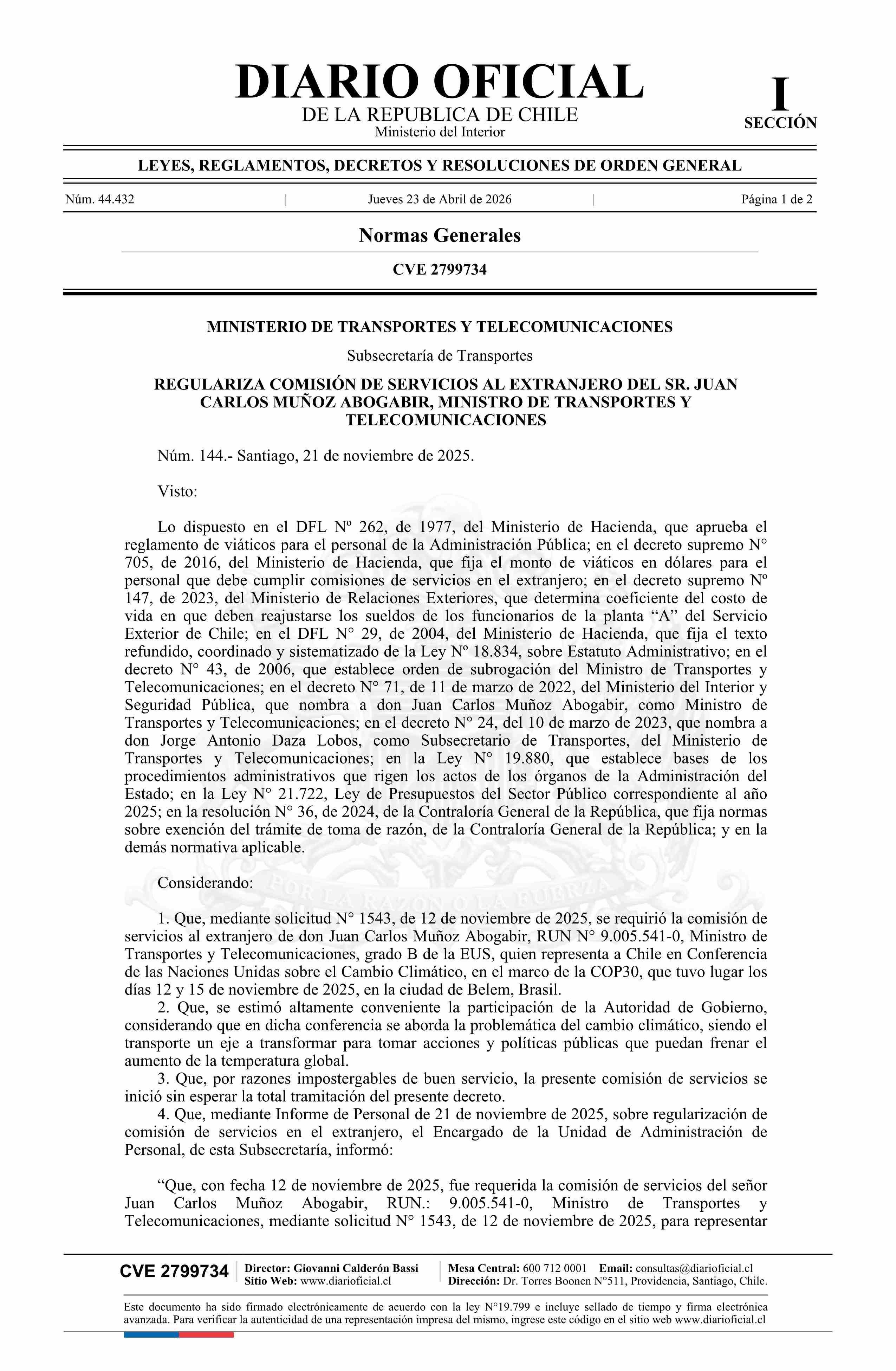 | Título: | Decreto número 144, de 2025.- Regulariza comisión de servicios al extranjero de don Juan Carlos Muñoz Abogabir, Ministro de Transportes y Telecomunicaciones |