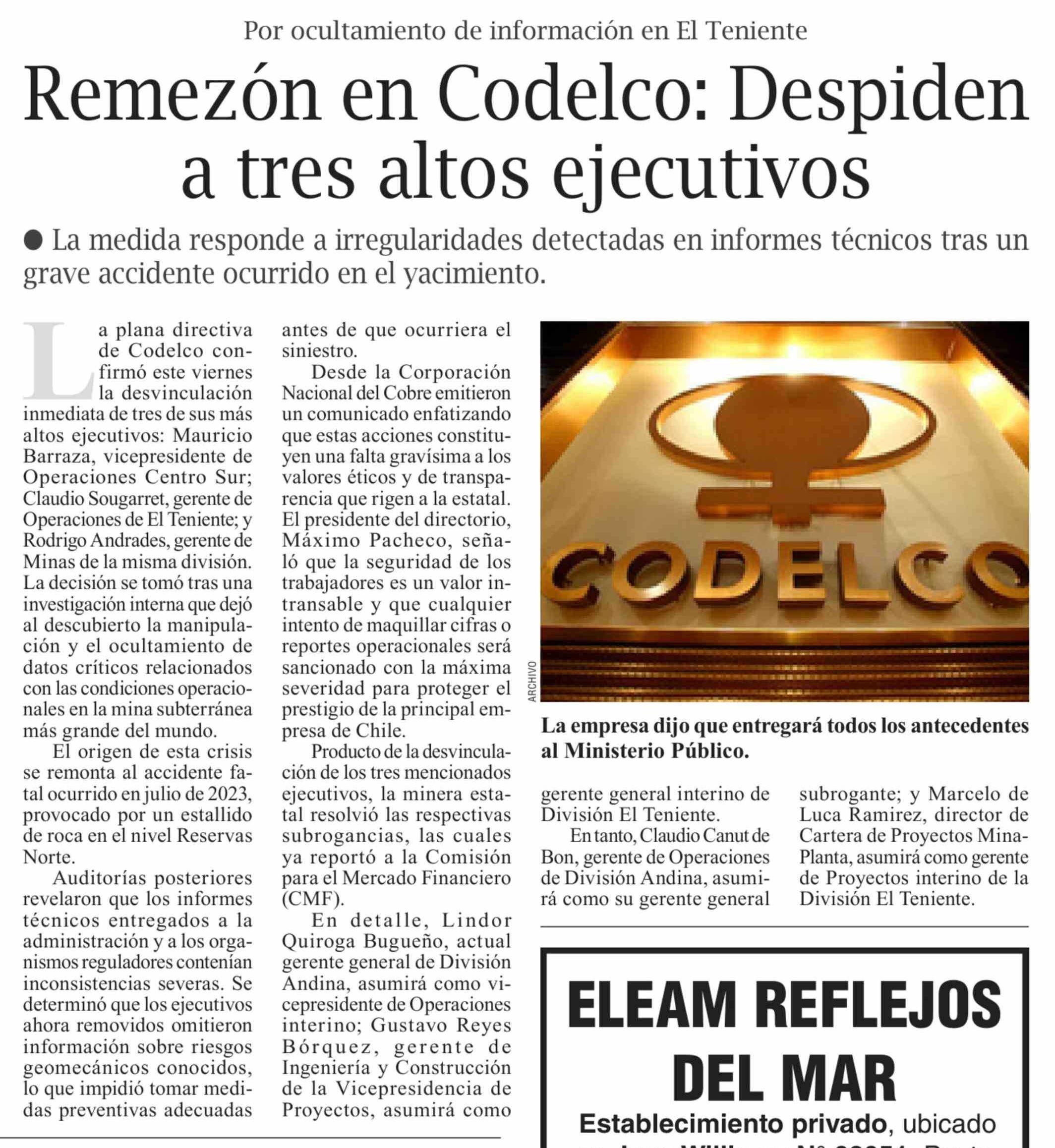 Remezón en Codelco: Despiden a tres altos ejecutivos