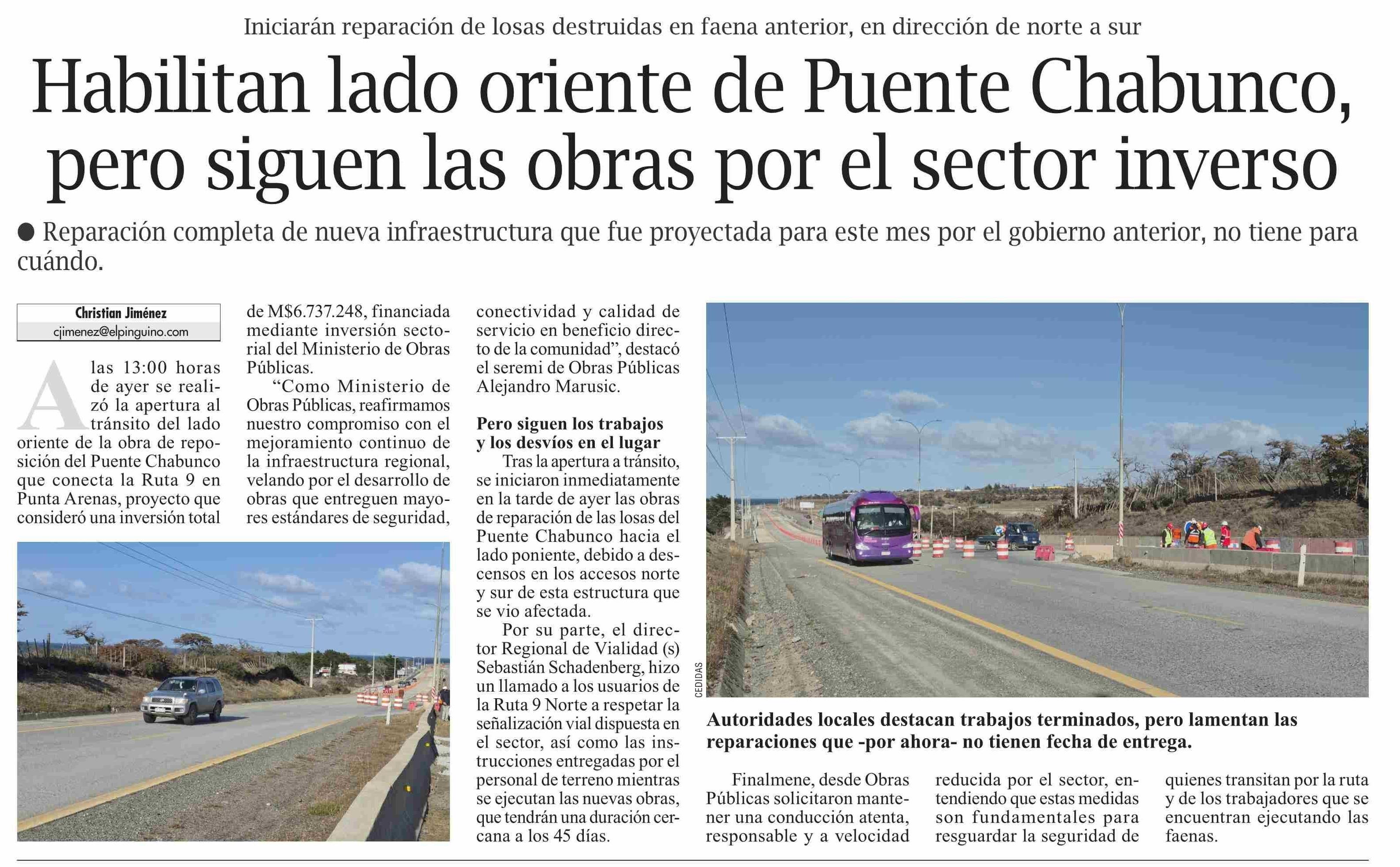 Habilitan lado oriente de Puente Chabunco, pero siguen las obras por el sector inverso