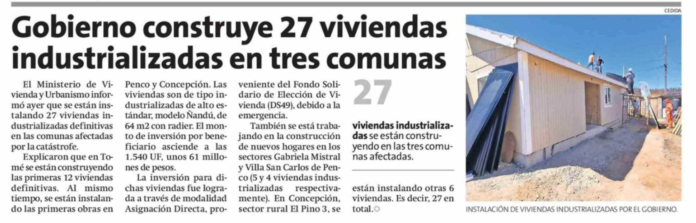 Gobierno construye 27 viviendas industrializadas en tres comunas