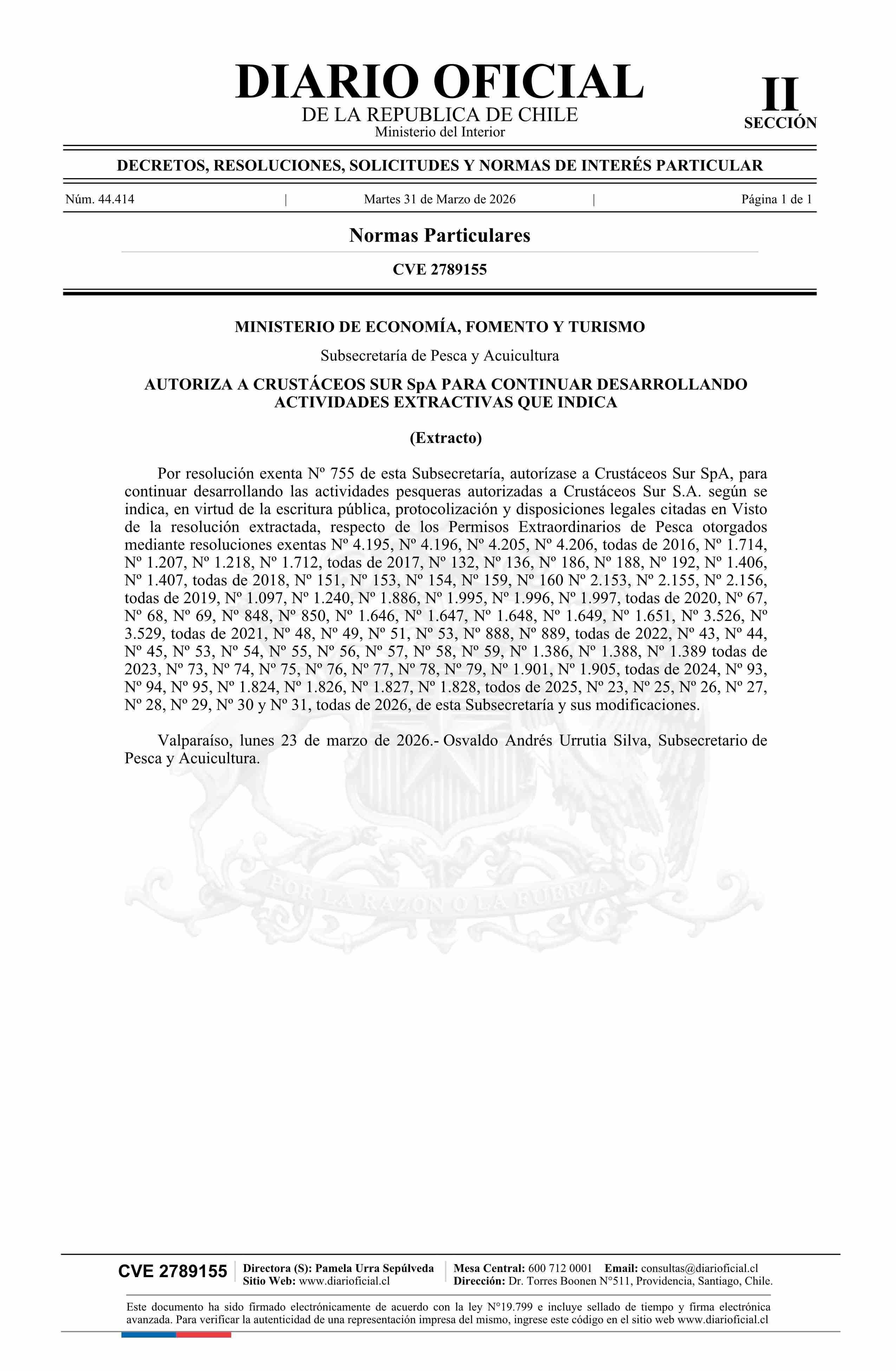 | Título: | Extracto de resolución exenta número 755, de 2026.- Autoriza a Crustáceos Sur SpA para continuar desarrollando actividades extractivas que indica |