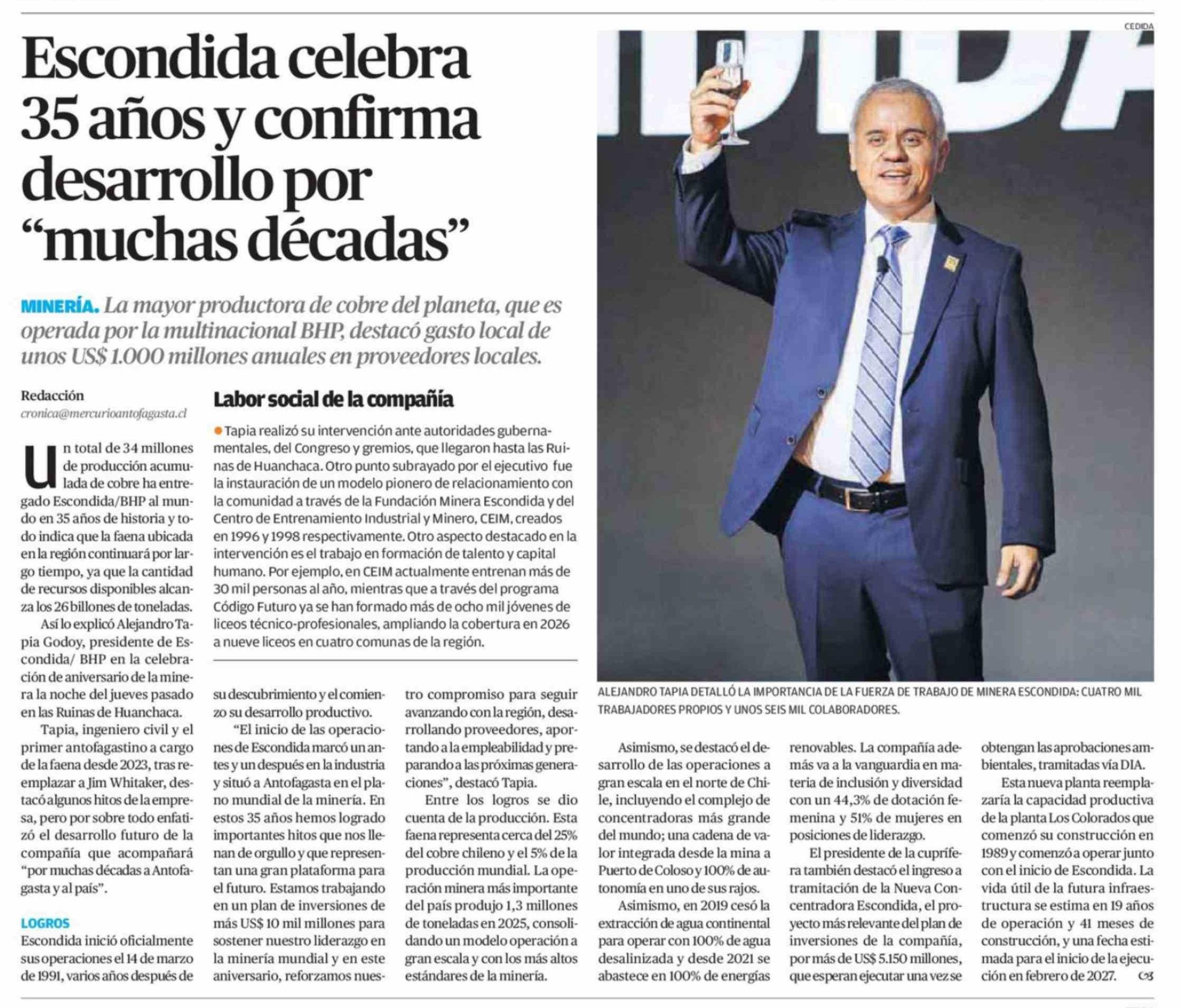 Escondida celebra 35 años y confirma desarrollo por "muchas décadas"