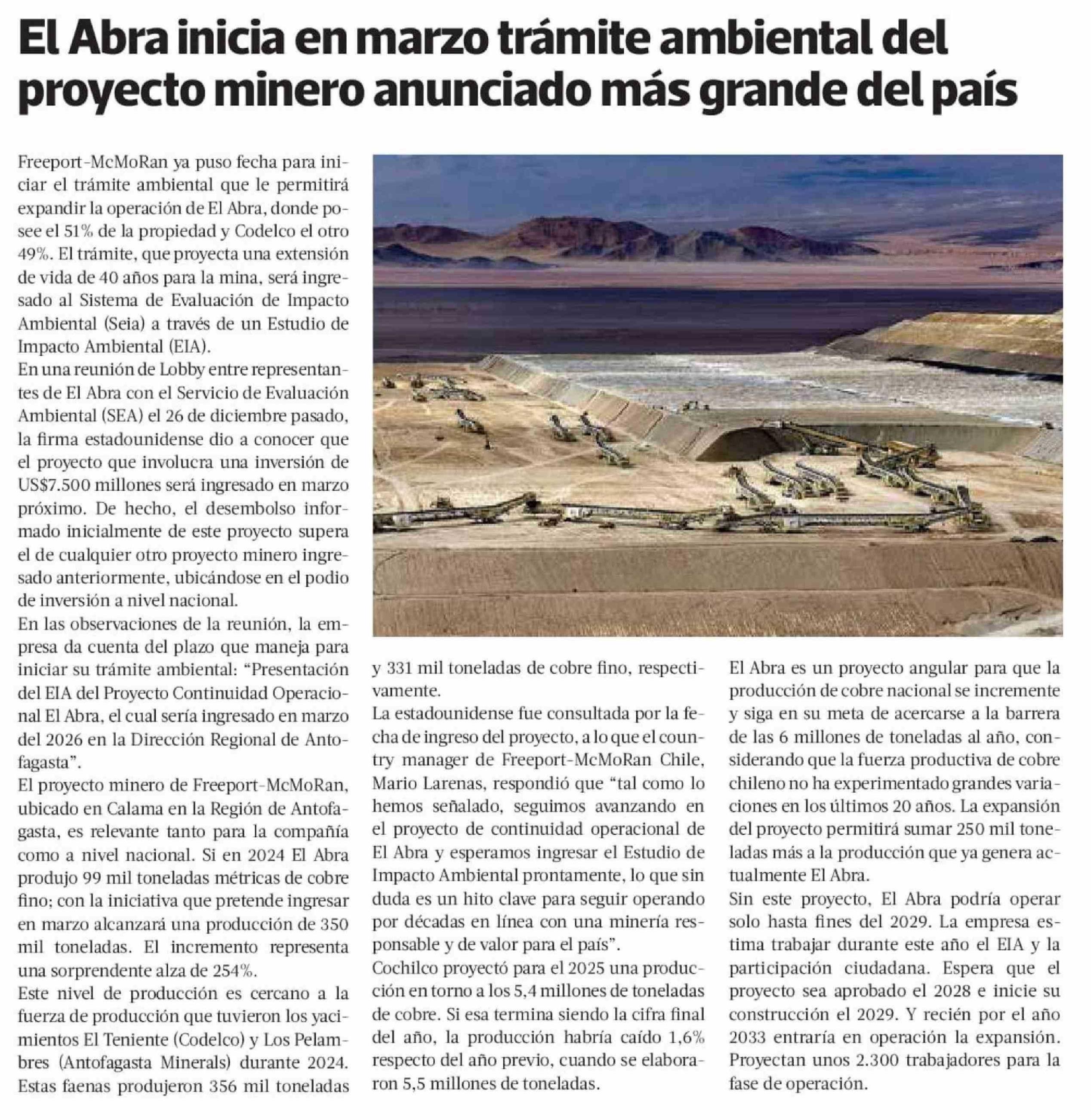 Título: El Abra inicia en marzo trámite ambiental del proyecto minero anunciado más grande del país