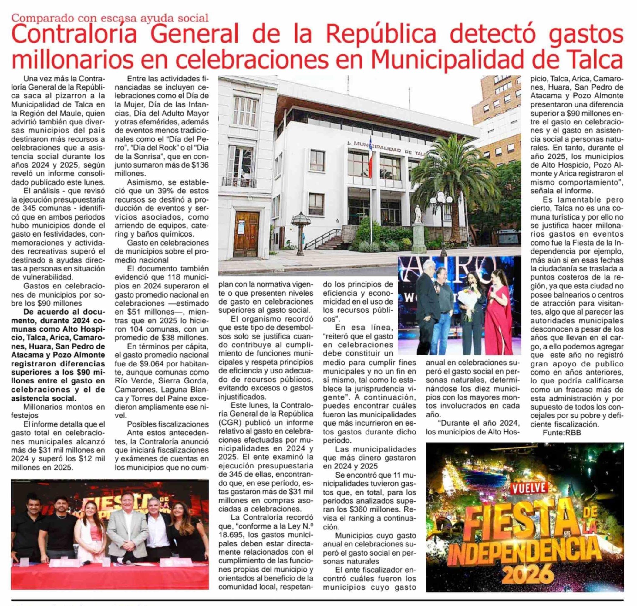 Contraloría General de la República detectó gastos millonarios en celebraciones en Municipalidad de Talca