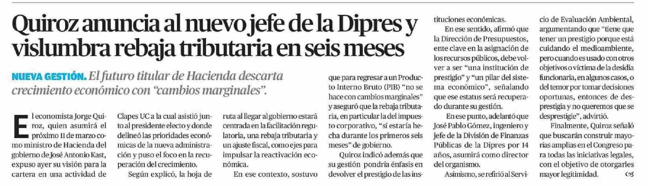 Quiroz anuncia al nuevo jefe de la Dipres y vislumbra rebaja tributaria en seis meses