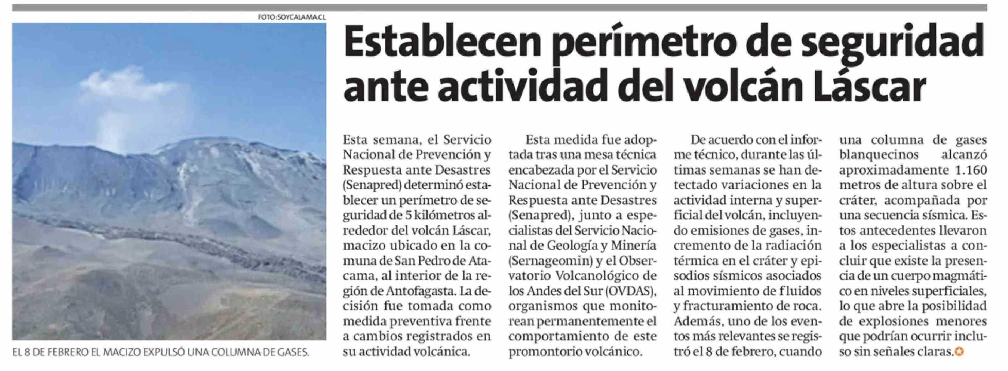 Establecen perímetro de seguridad ante actividad del volcán Láscar