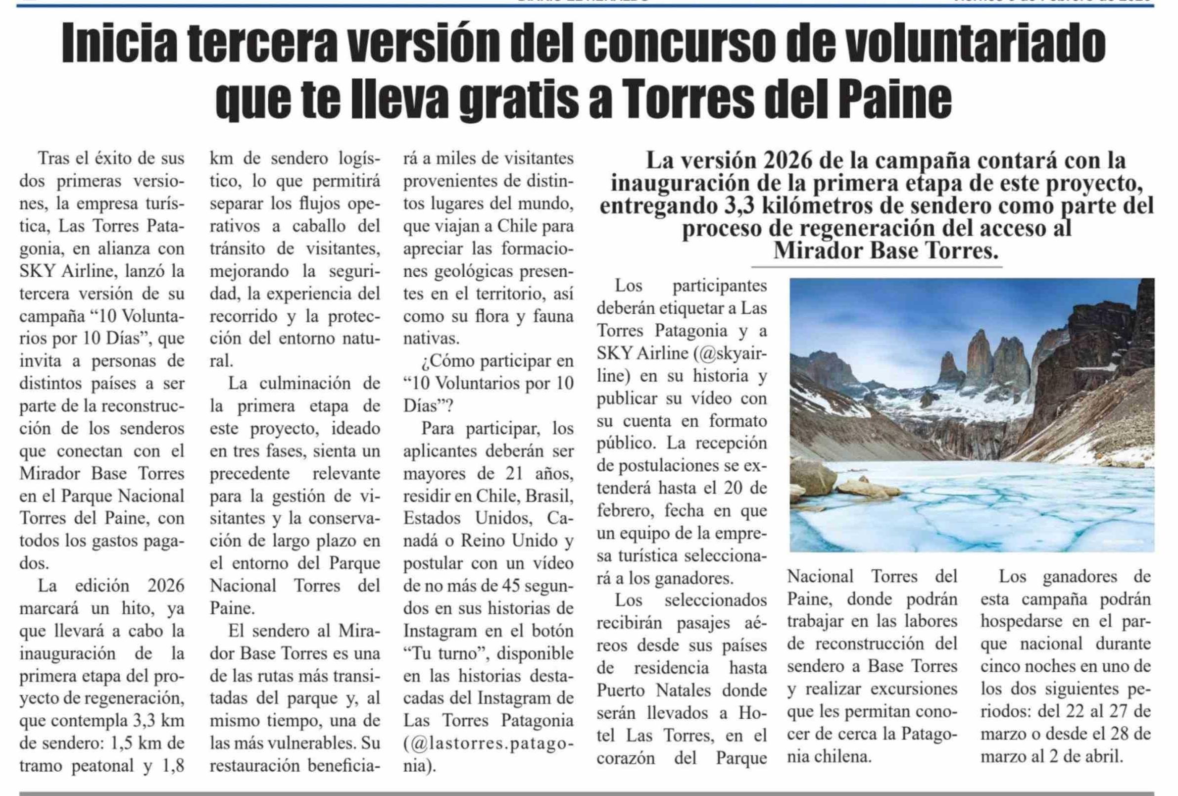 Inicia tercera versión del concurso de voluntariado que te lleva gratis a Torres del Paine