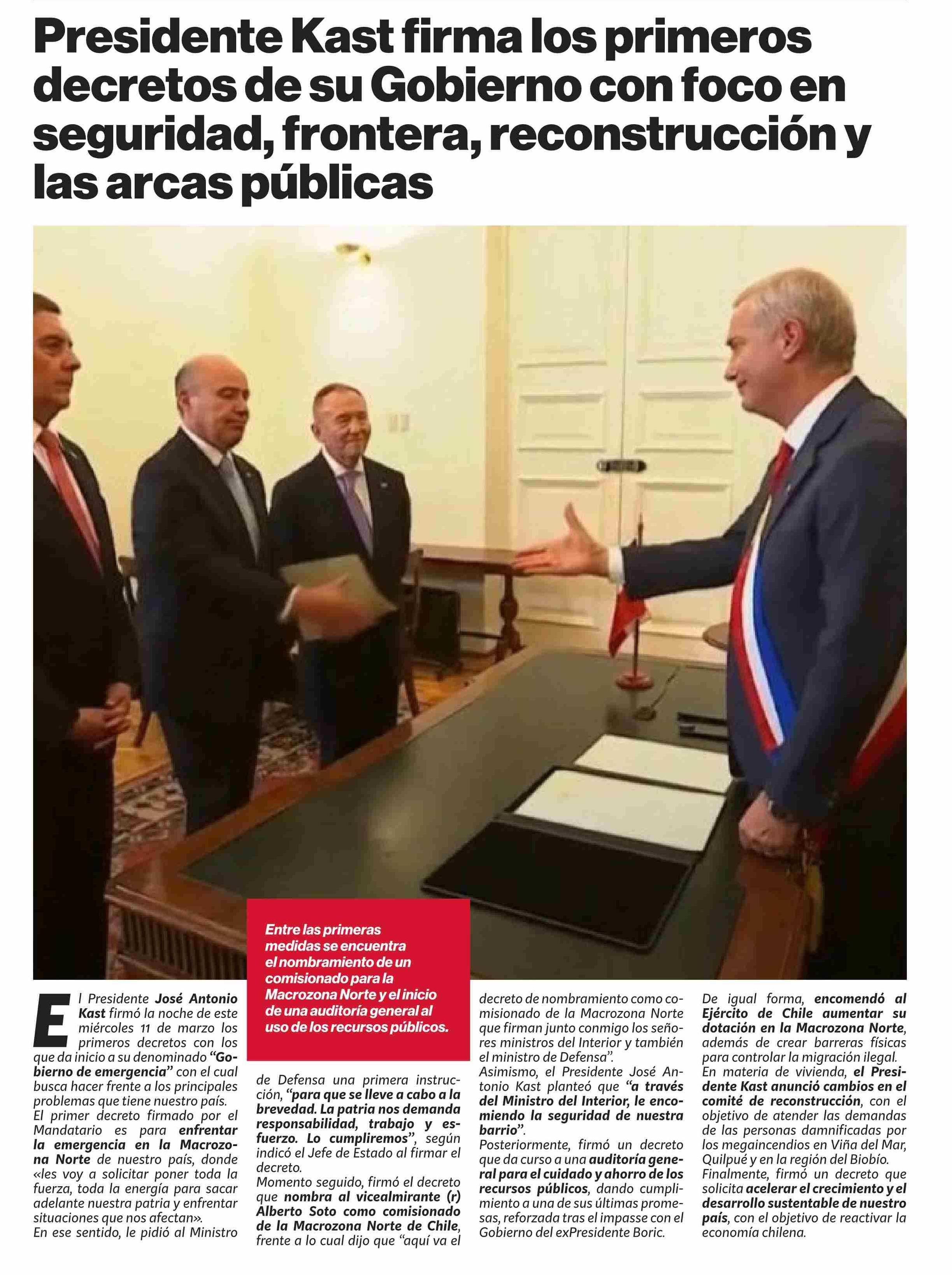 Título: Presidente Kast firma los primeros decretos de su Gobierno con foco en seguridad, frontera, reconstrucción y las arcas públicas