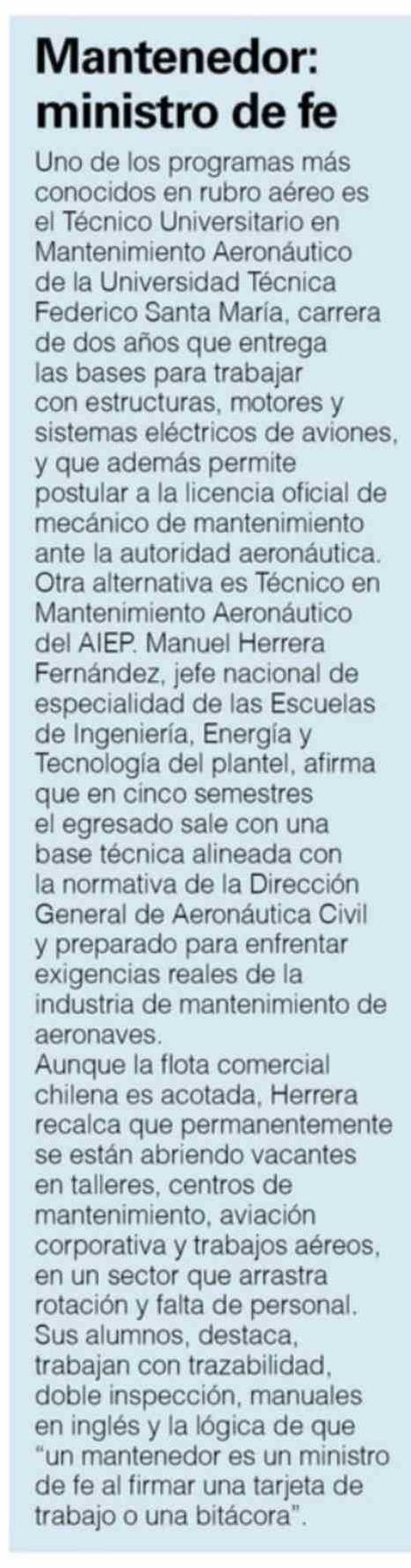 | Título: | Mantenedor: ministro de fe Uno de los programas más conocidos en rubro aéreo es el Técnico Universitario en Mantenimiento Aeronáutico de la Universidad Técnica Federico Santa María, carrera de dos años que entrega las bases para trabajar con estructuras, motores y sistemas eléctricos de aviones, y q |