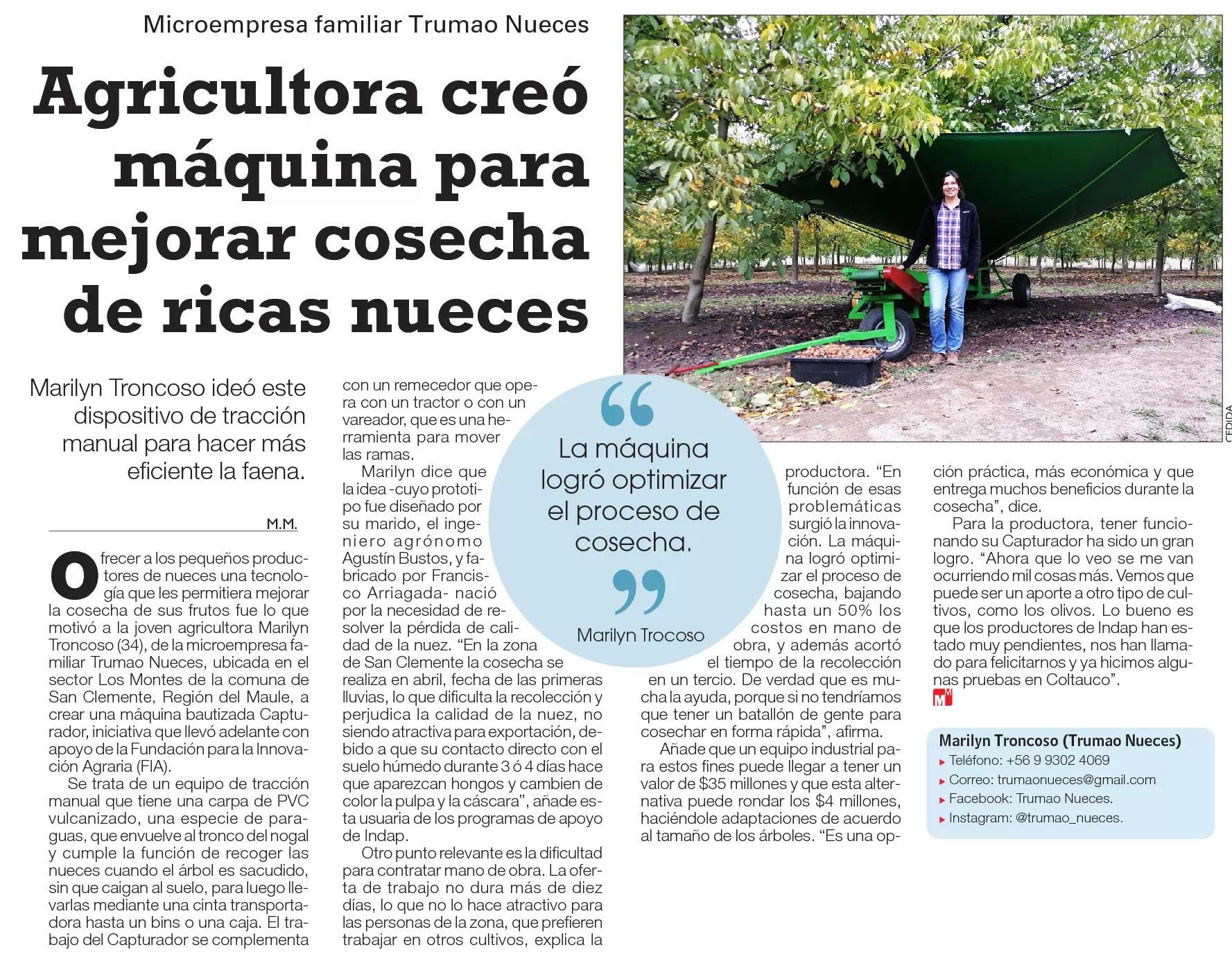 Agricultora creó máquina para mejorar cosecha de ricas nueces