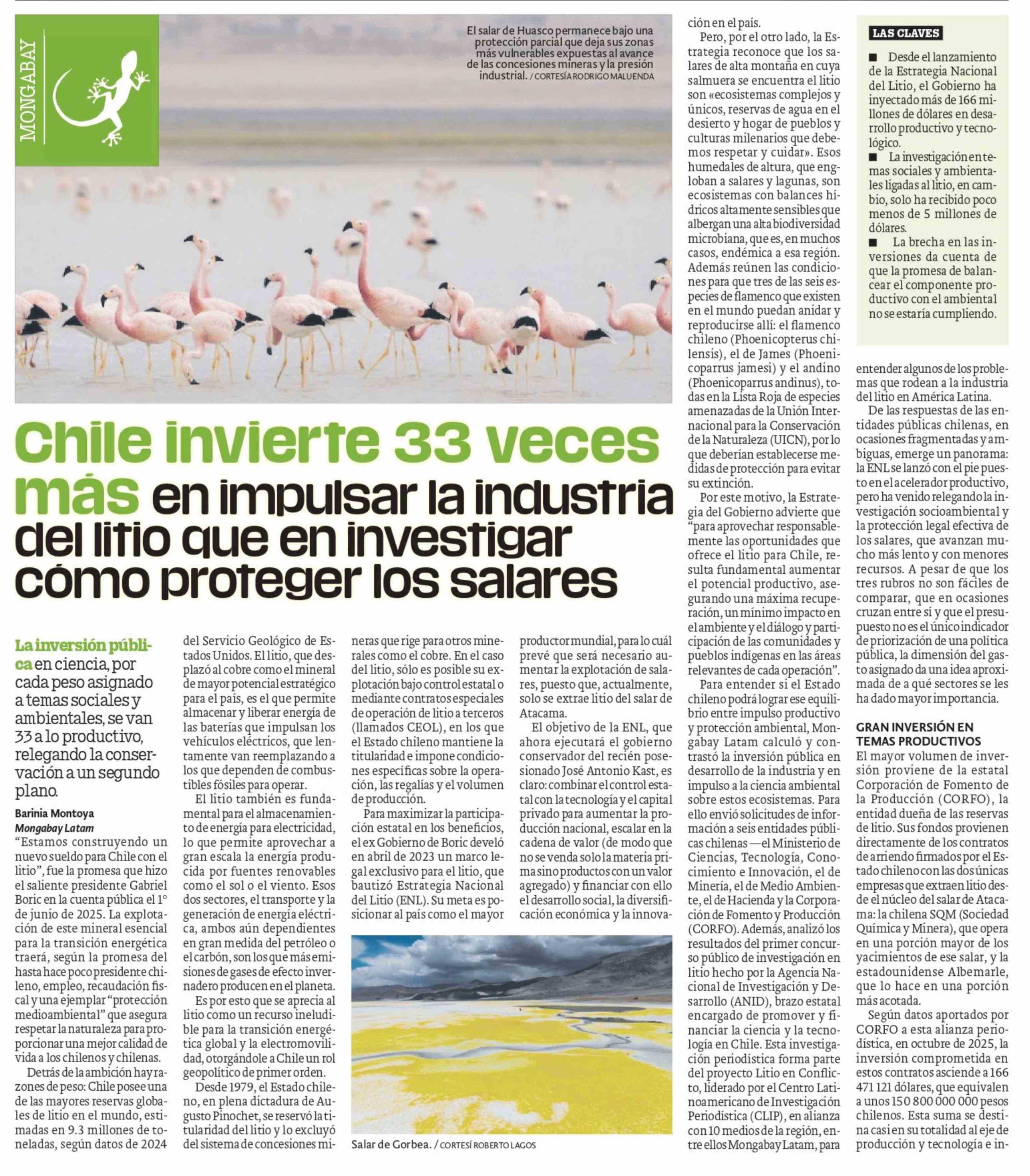 Chile invierte 33 veces más en impulsar la industria del litio que en investigar como proteger los salares