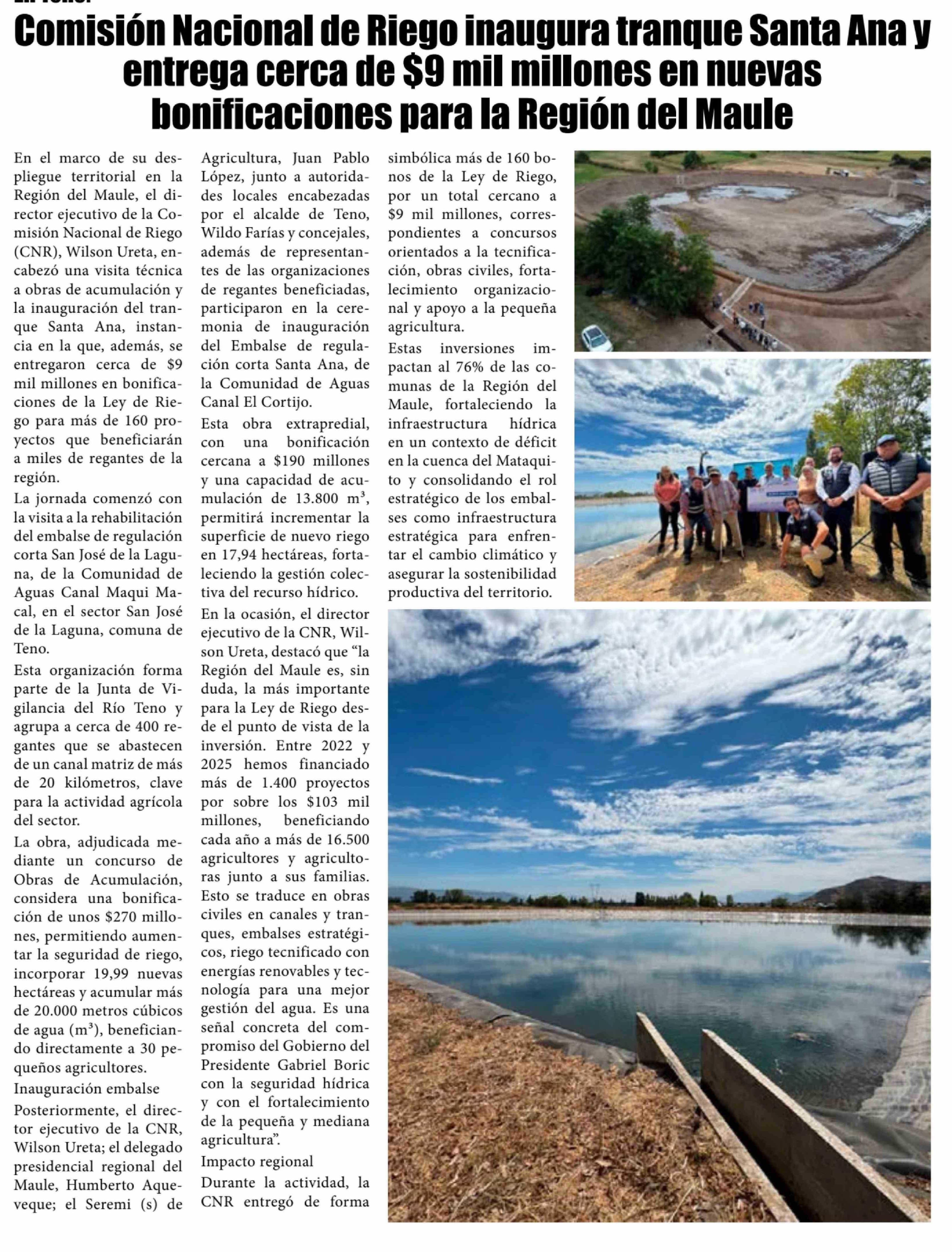 Título: Comisión Nacional de Riego inaugura tranque Santa Ana y entrega cerca de $9 mil millones en nuevas bonificaciones para la Región del Maule