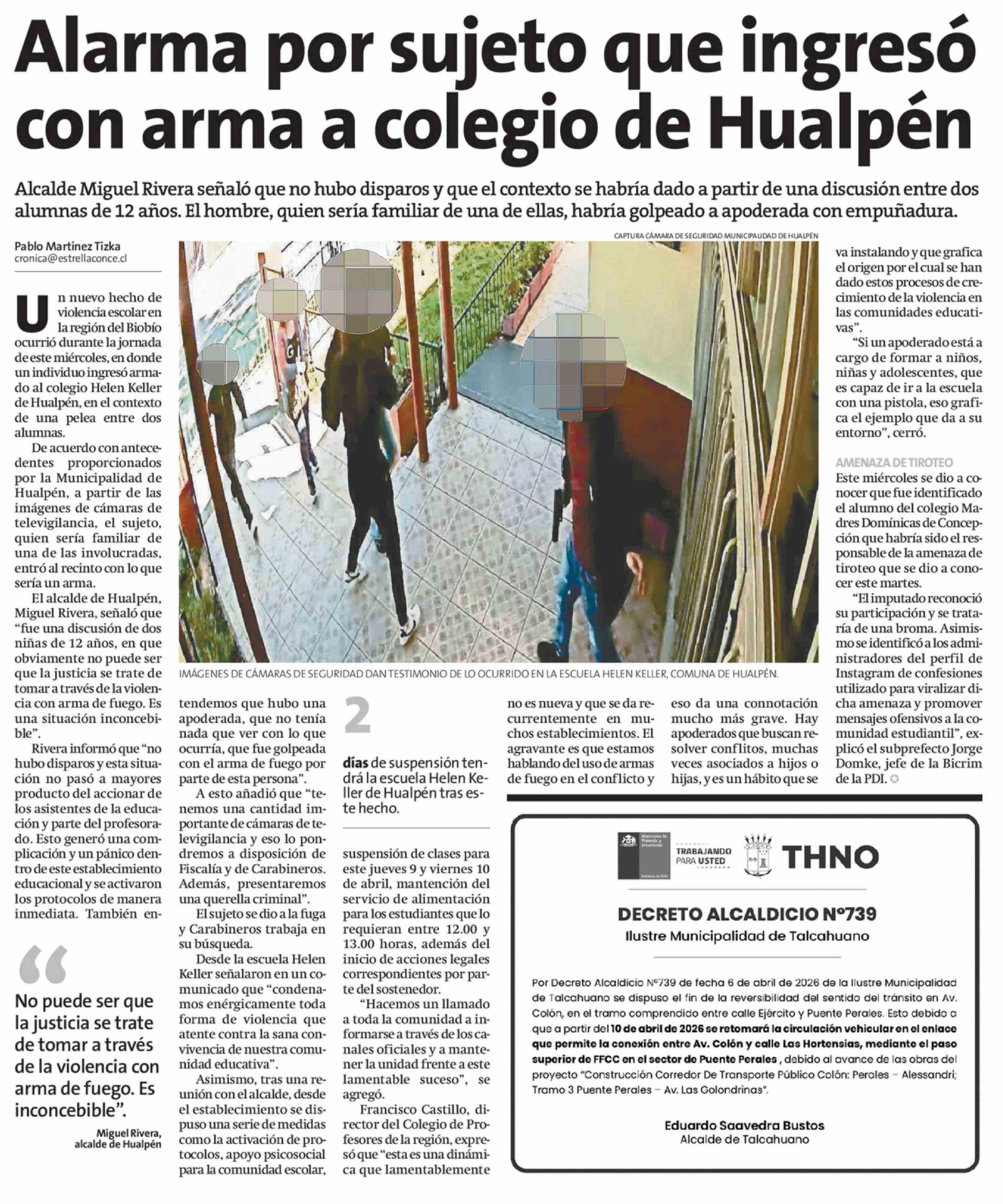 Alarma por sujeto que ingresó con arma a colegio de Hualpen