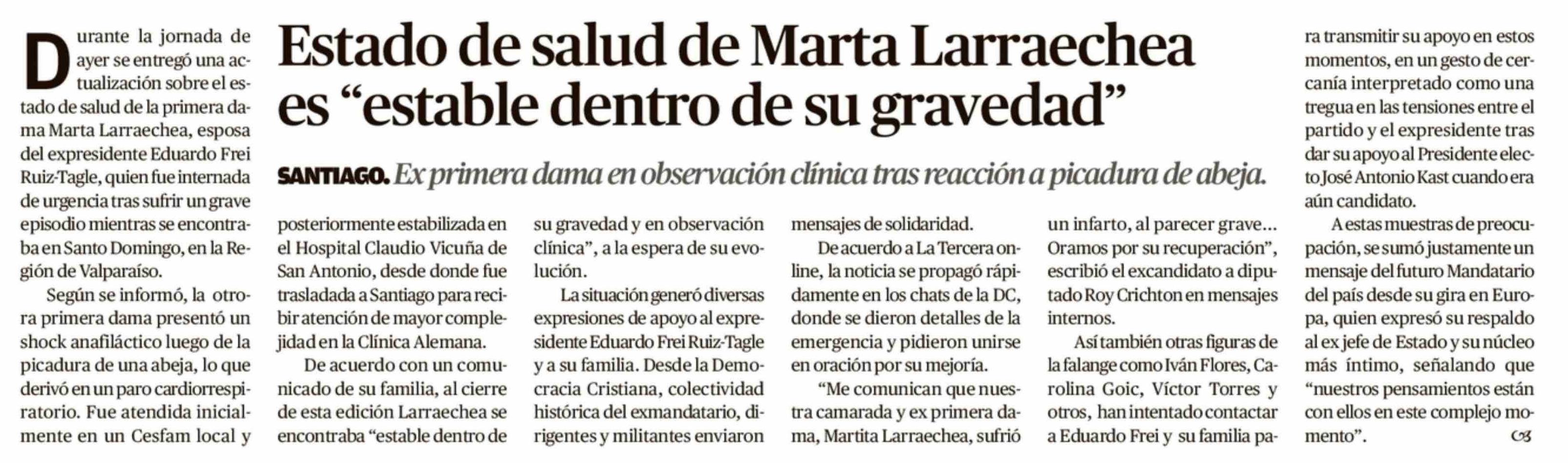Estado de salud de Marta Larraechea es "estable dentro de su gravedad"