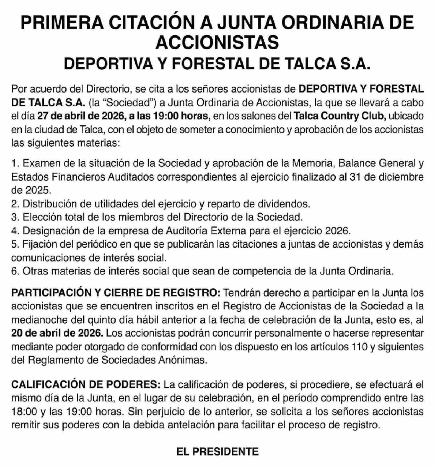 PRIMERA CITACIÓN A JUNTA ORDINARIA DE ACCIONISTAS