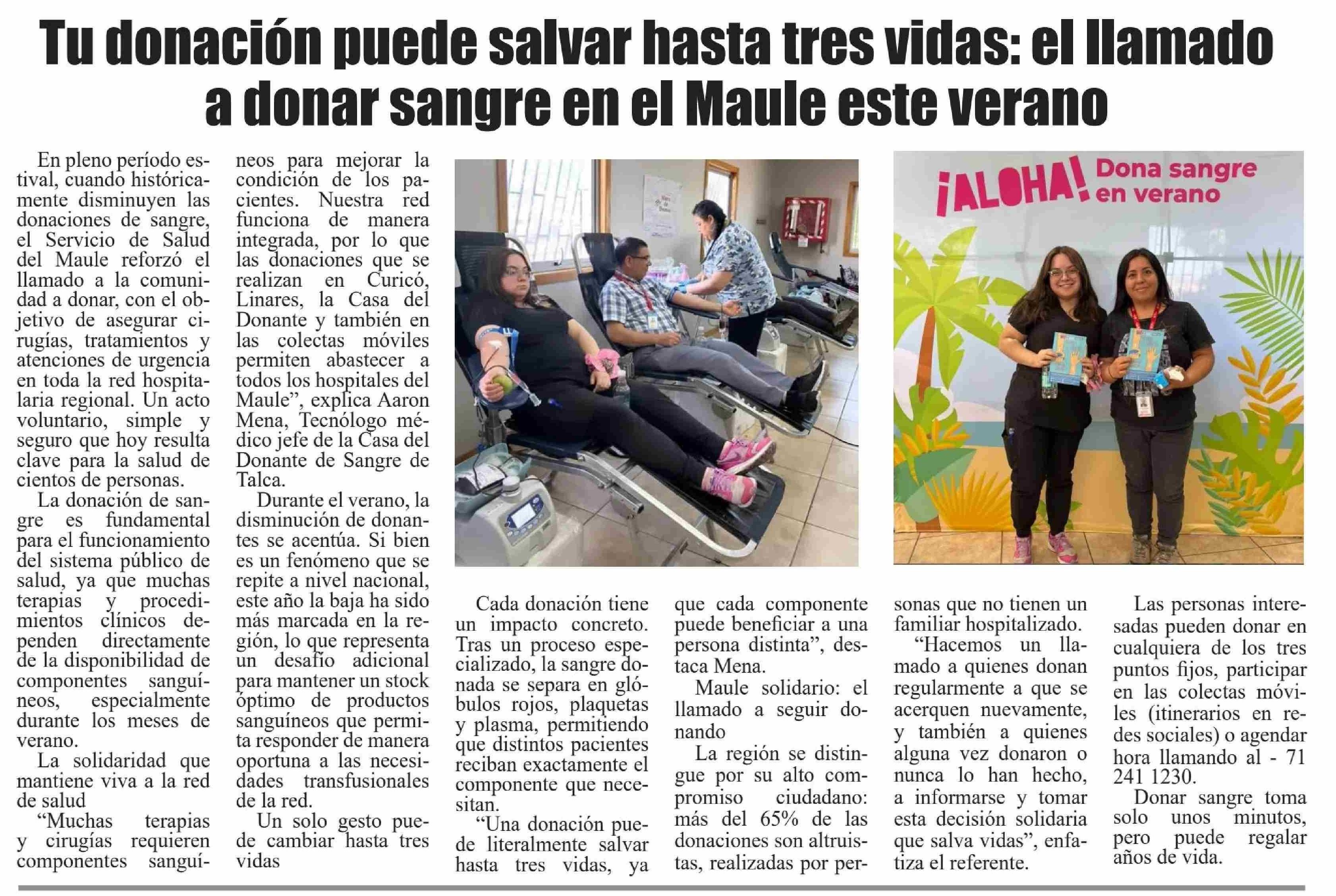 Tu donación puede salvar hasta tres vidas: el llamado a donar sangre en el Maule este verano
