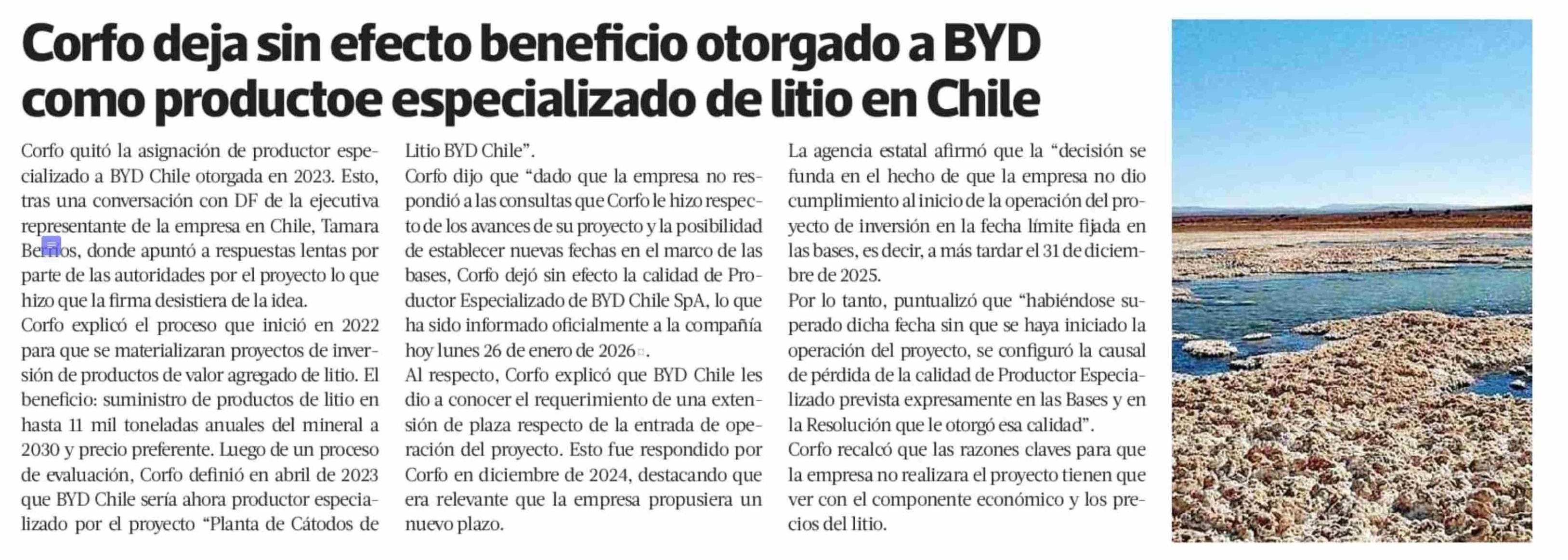 Corfo deja sin efecto beneficio otorgado a BYD como productoe especializado de litio en Chile