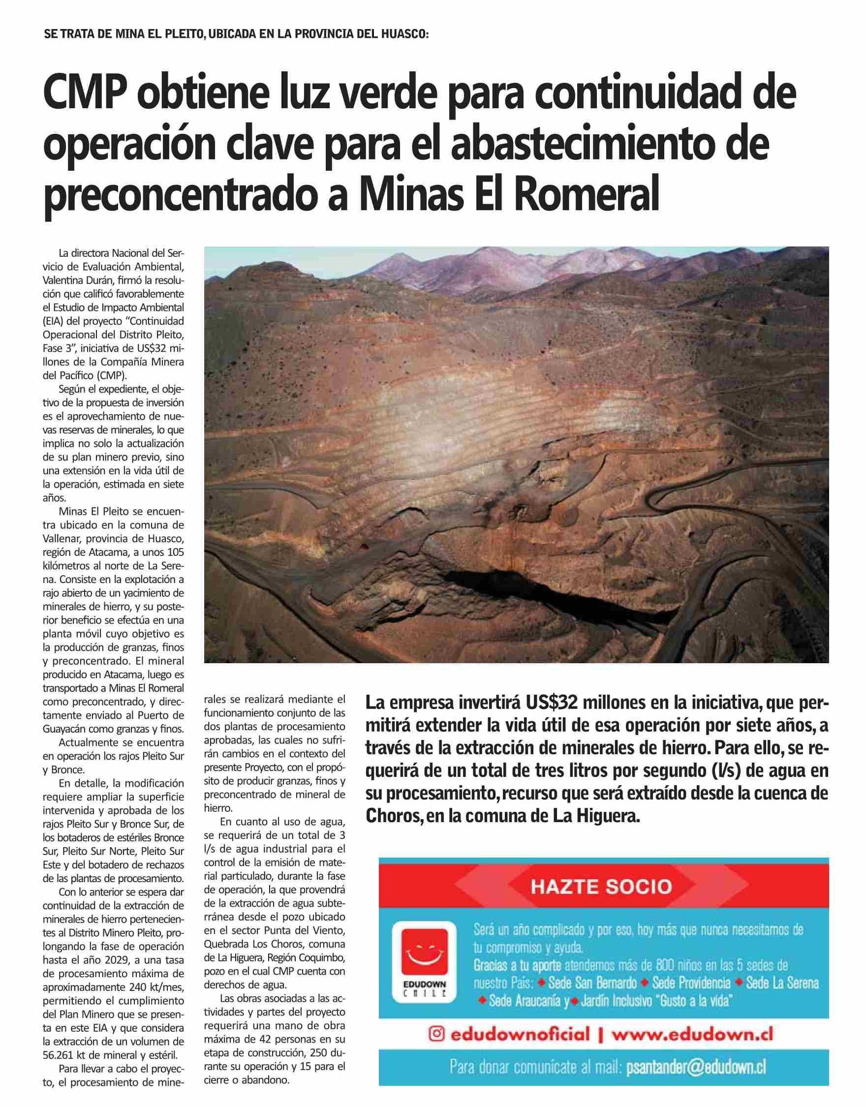 CMP obtiene luz verde para continuidad de operación clave para el abastecimiento de preconcentrado a Minas El Romeral