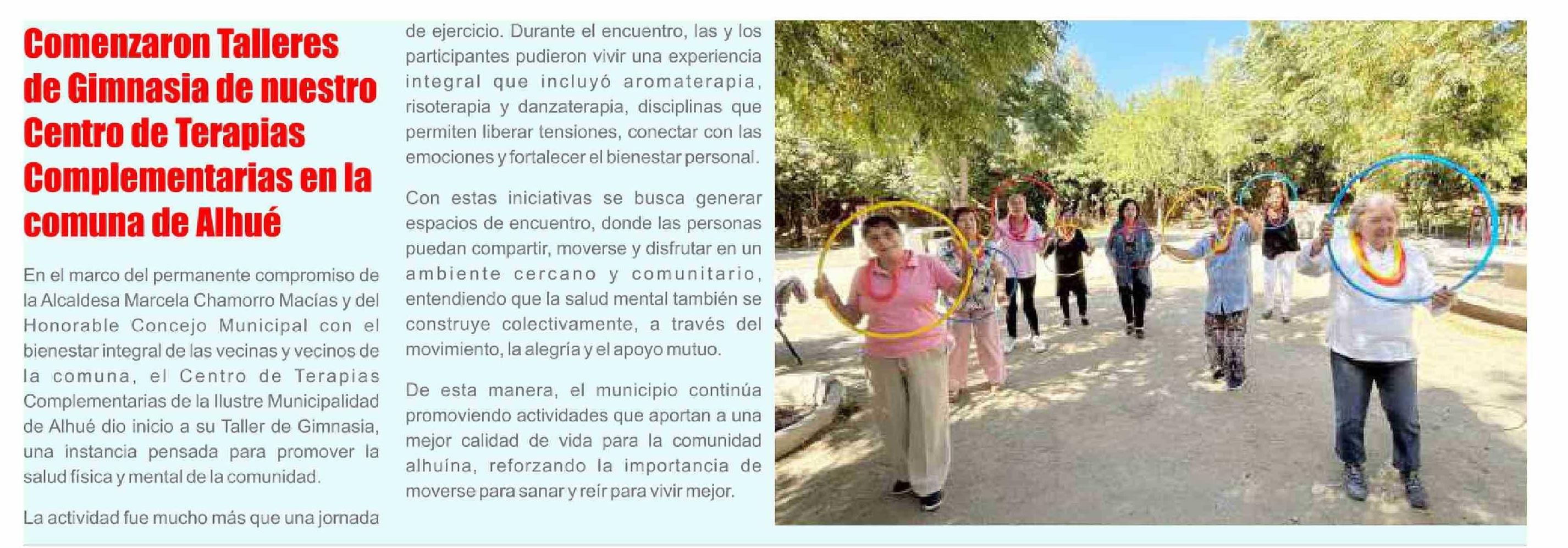 | Título: | En el marco del permanente compromiso de la Alcaldesa Marcela Chamorro Macías y del Honorable Concejo Municipal con el bienestar integral de las vecinas y vecinos de la comuna, el Centro de Terapias Complementarias de la Ilustre Municipalidad de Alhué dio inicio a su Taller de Gimnasia, una instanci |