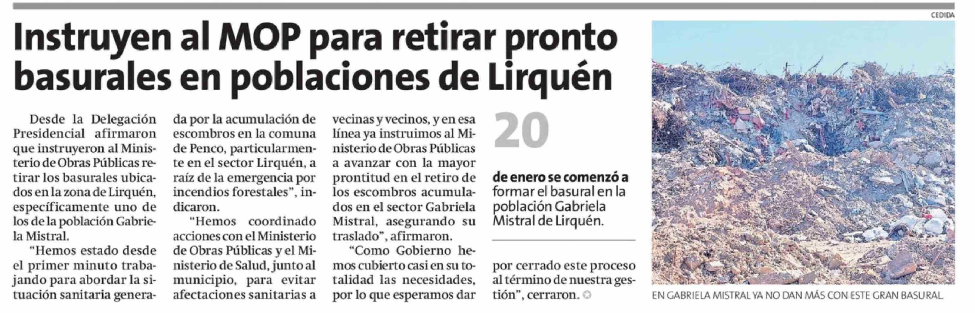 Instruyen al MOP para retirar pronto basurales en poblaciones de Lirquén