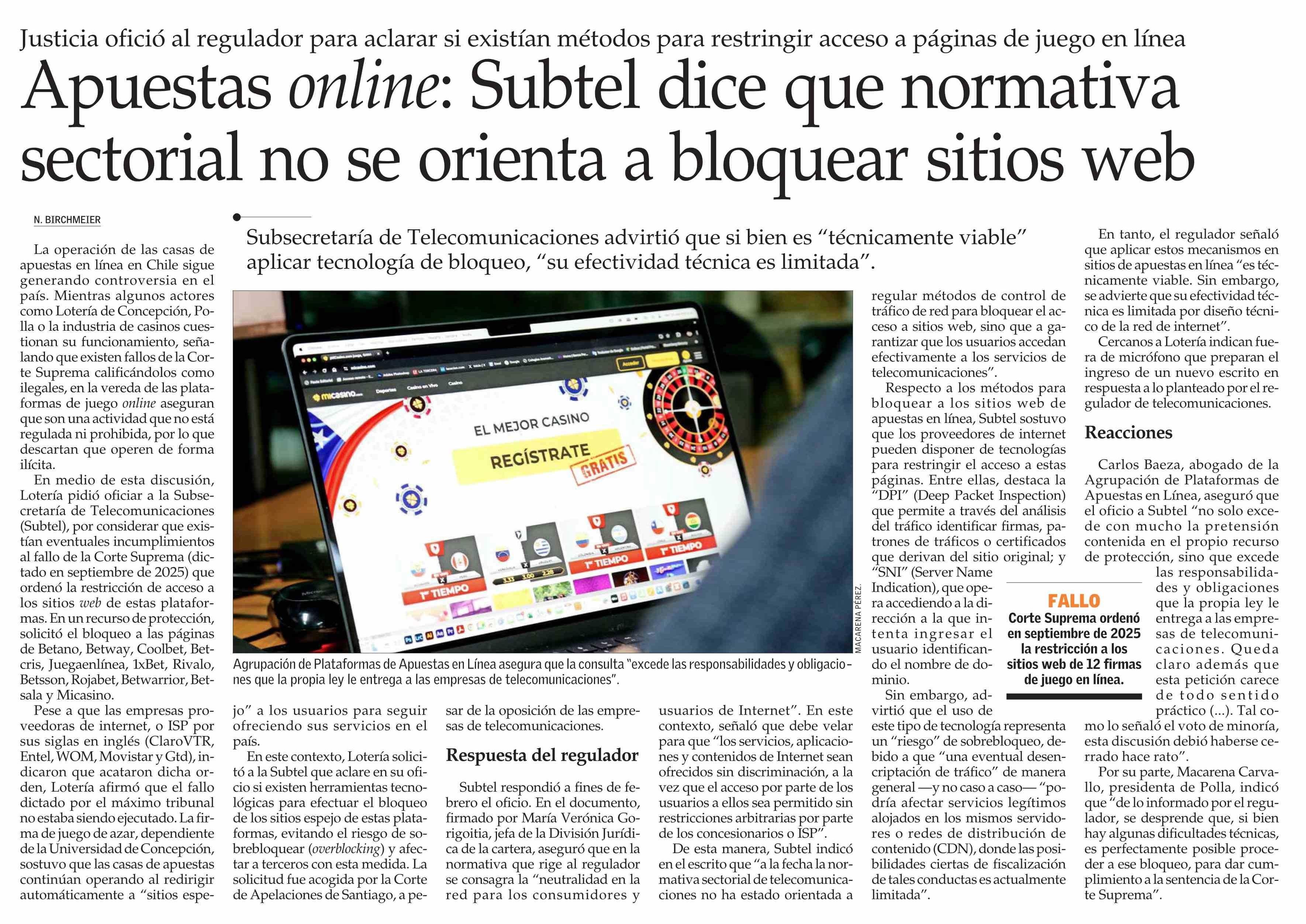 Apuestas online: Subtel dice que normativa sectorial no se orienta a bloquear sitios web