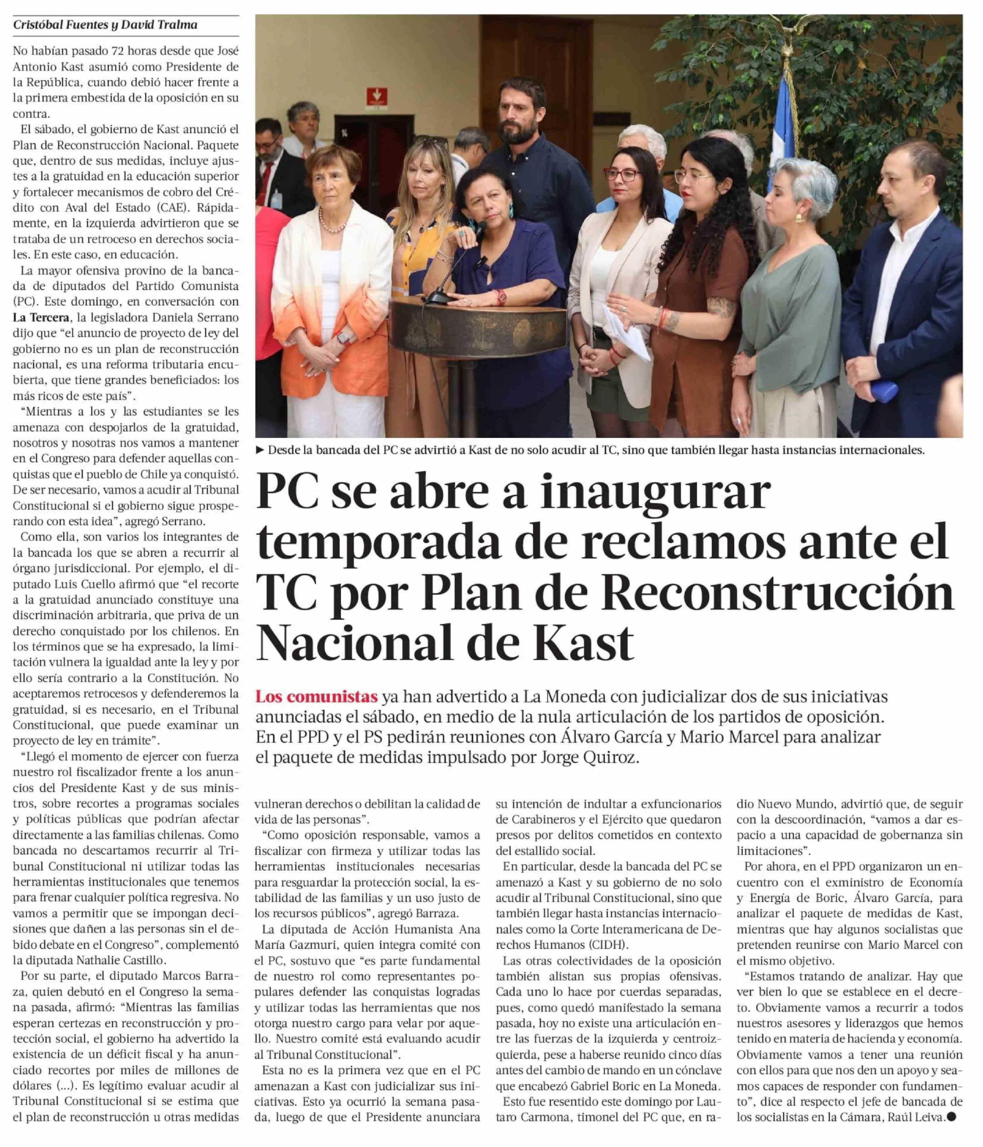 PC se abre a inaugurar temporada de reclamos ante el TC por Plan de Reconstrucción Nacional de Kast