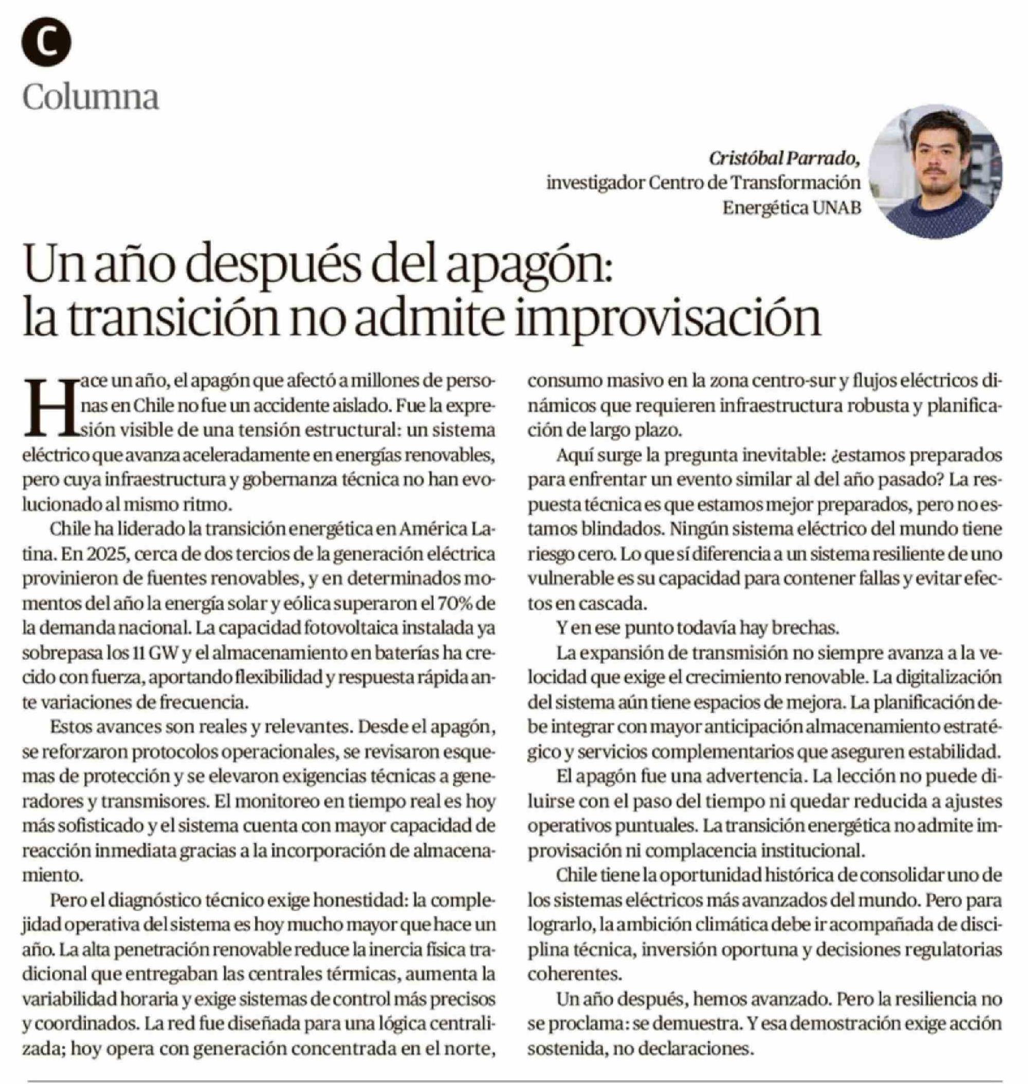 Columnas de Opinión: Un año después del apagón: la transición no admite improvisación