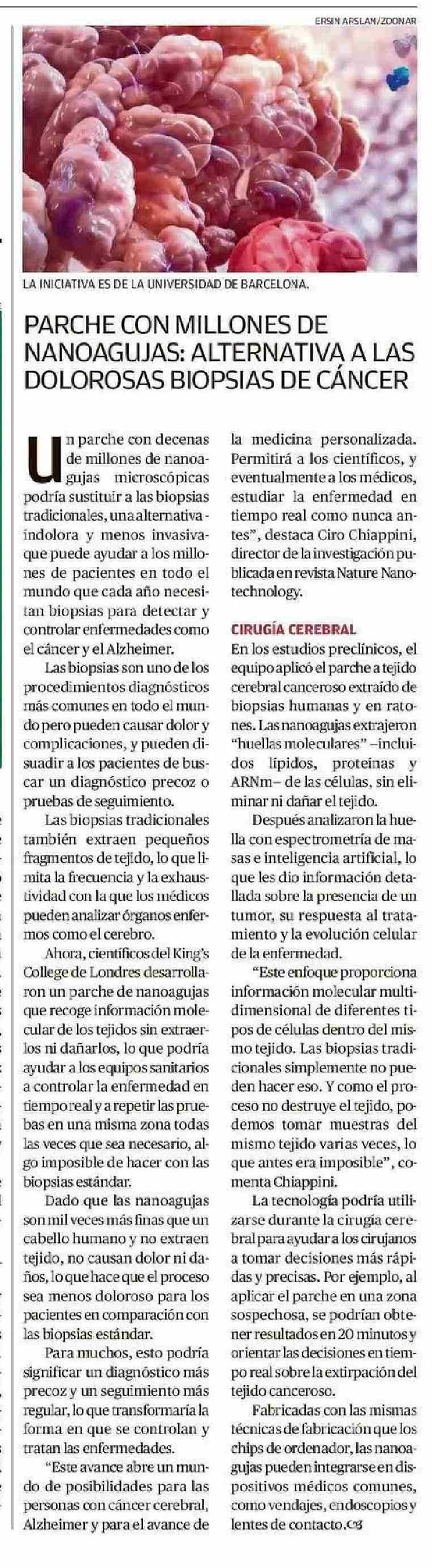 PARCHE CON MILLONES DE NANOAGUJAS: ALTERNATIVA A LAS DOLOROSAS BIOPSIAS DE CANCER