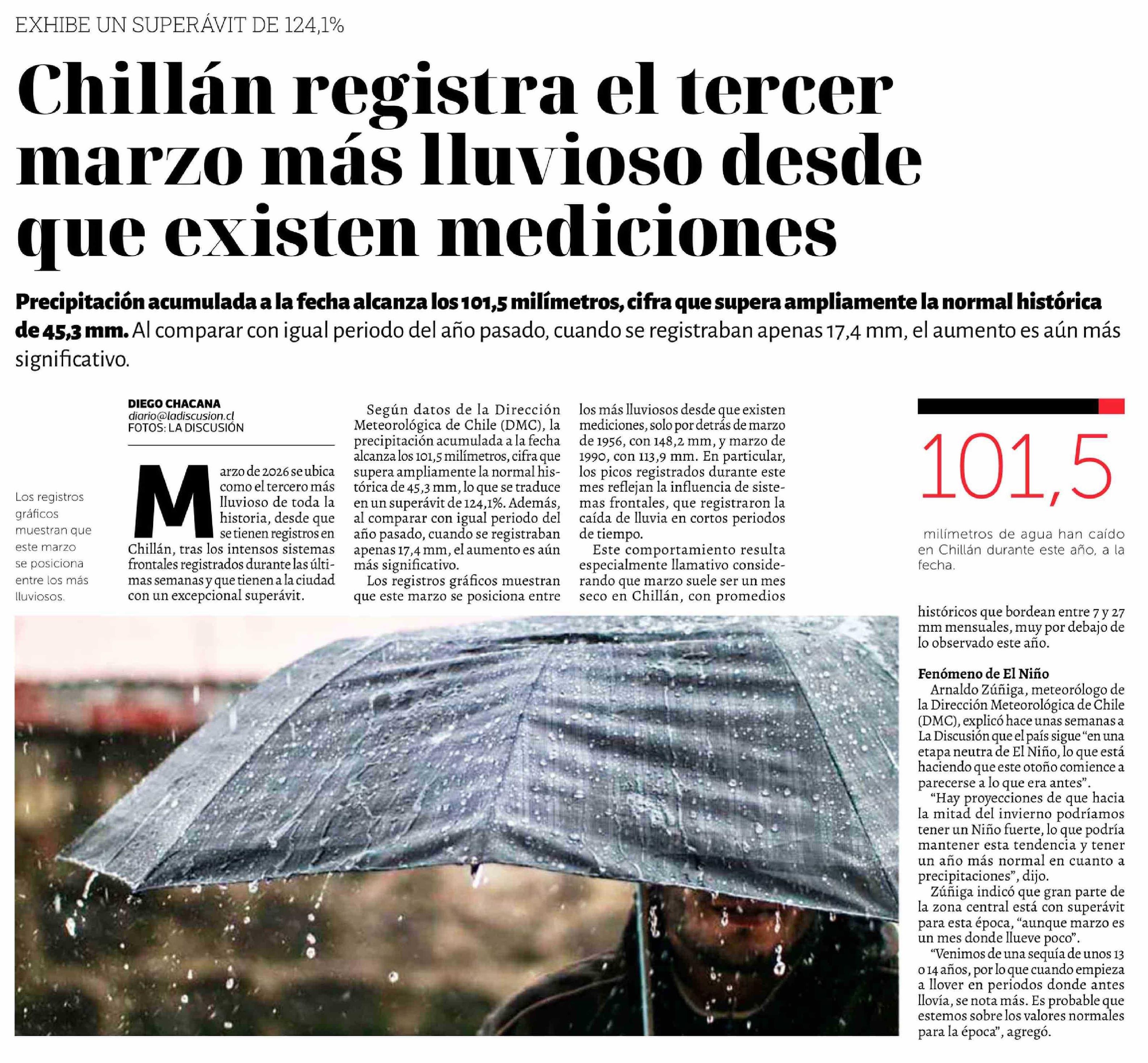 Chillán registra el tercer marzo más lluvioso desde que existen mediciones