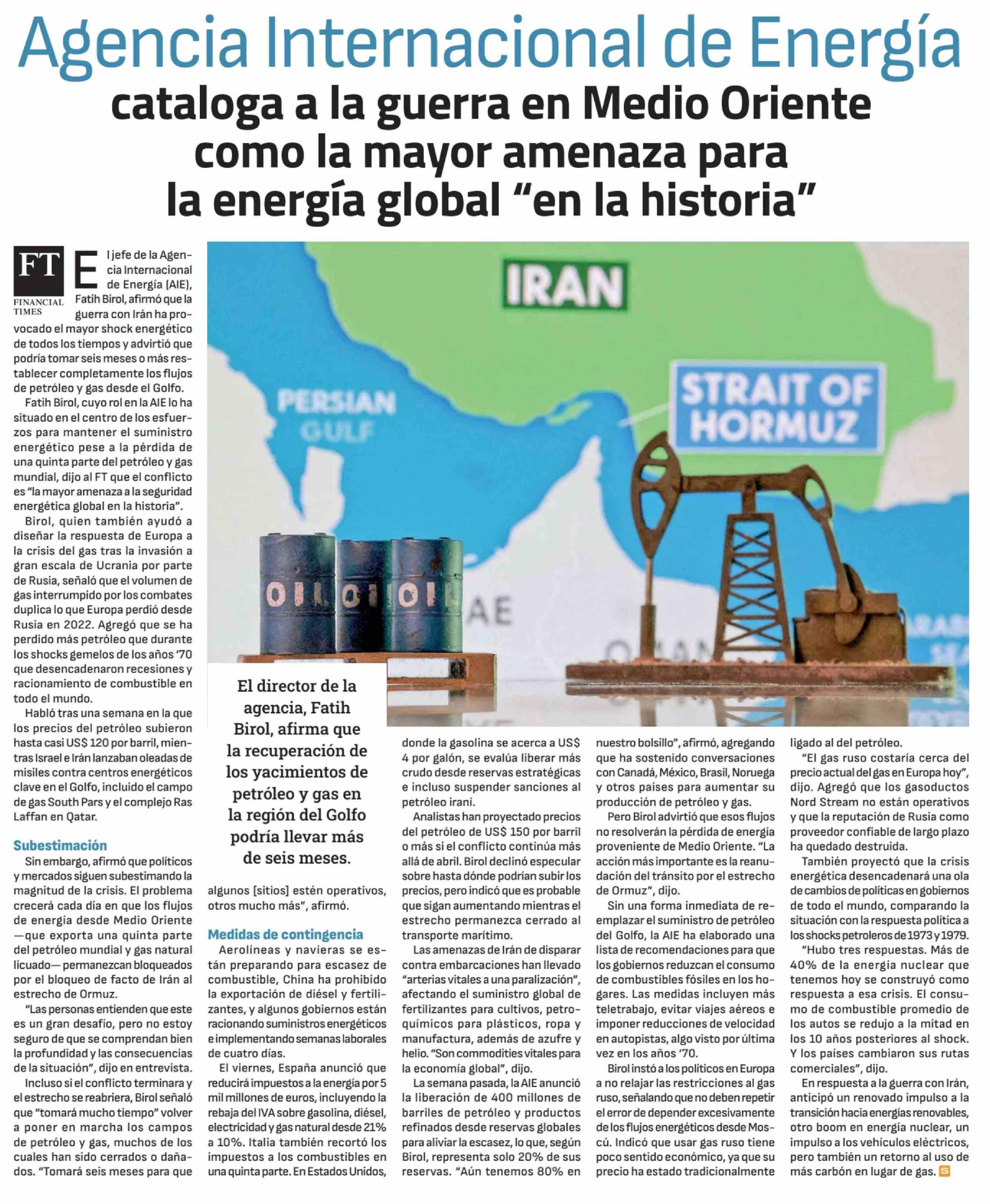 | Título: | Agencia Internacional de Energía cataloga a la guerra en Medio Oriente como la mayor amenaza para la energía global "en la historia" |