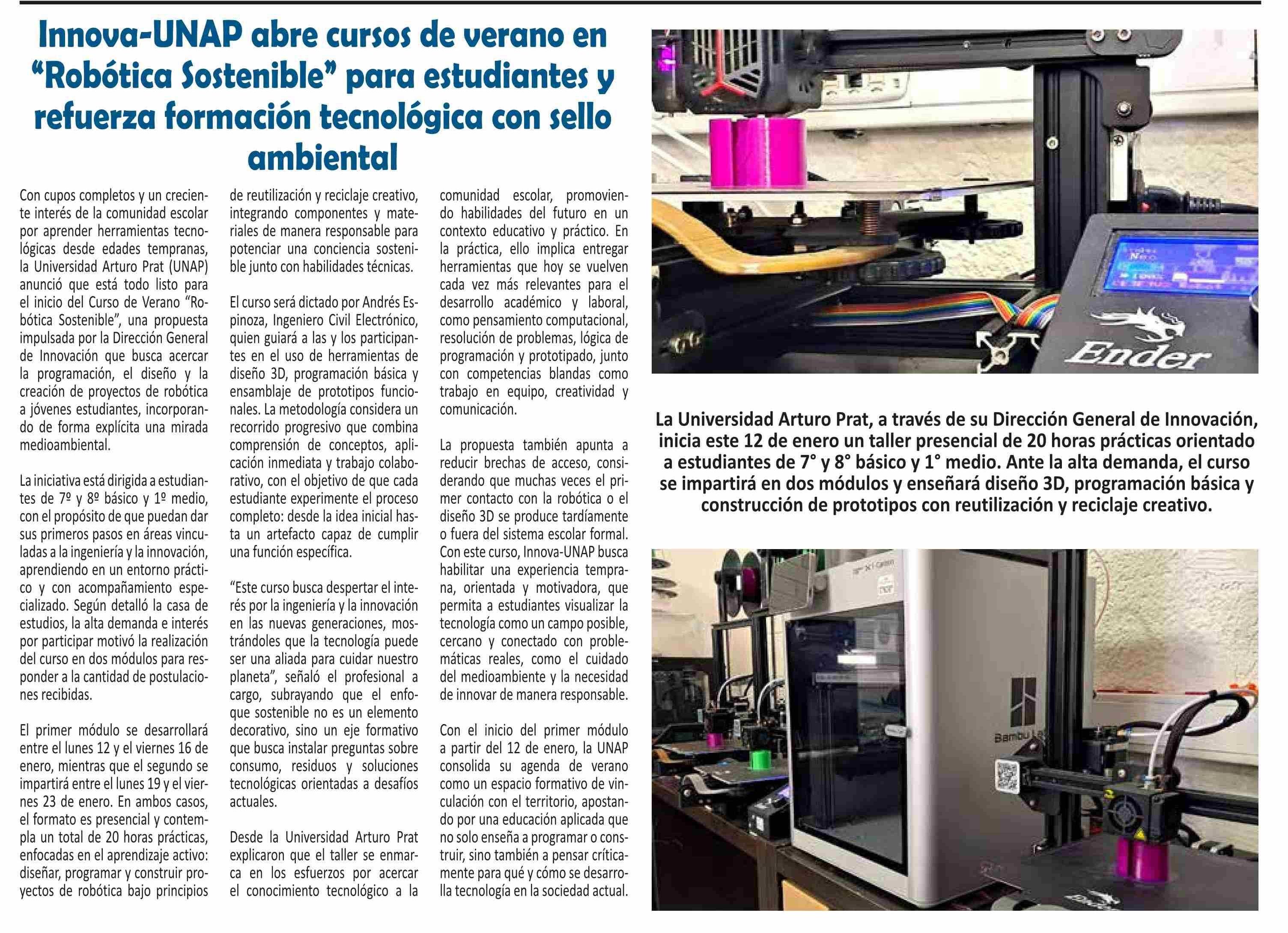 Innova-UNAP abre cursos de verano en "Robótica Sostenible" para estudiantes y refuerza formación tecnológica con sello ambiental