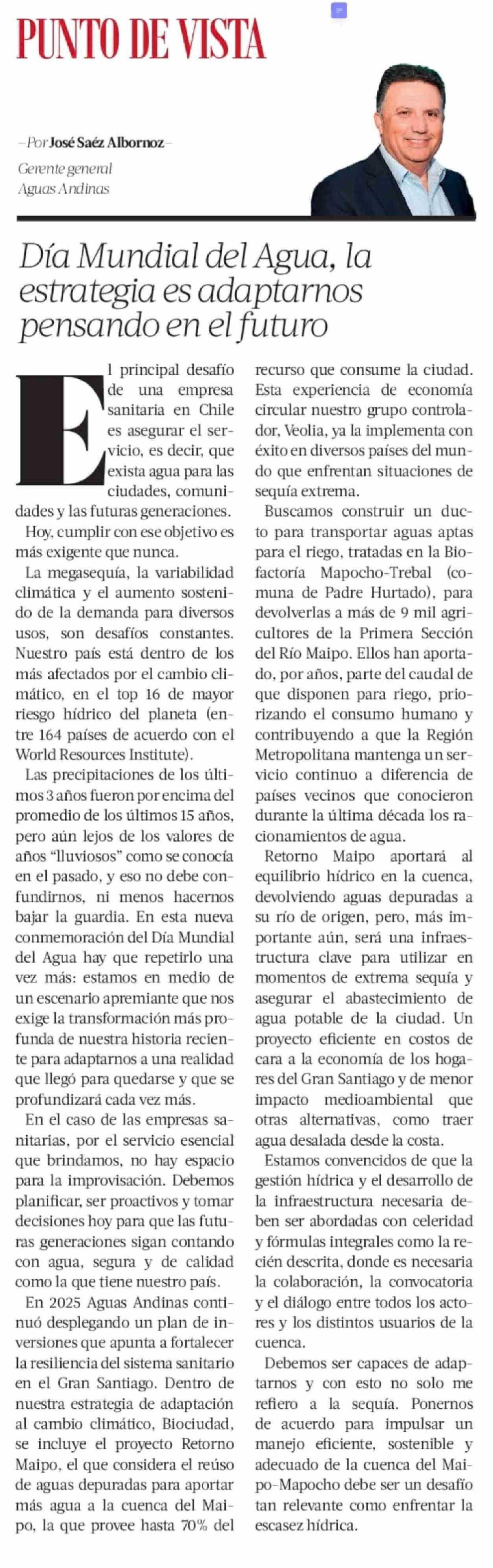 Título: Columnas de Opinión: Día Mundial del Agua, la estrategia es adaptarnos pensando en el futuro
