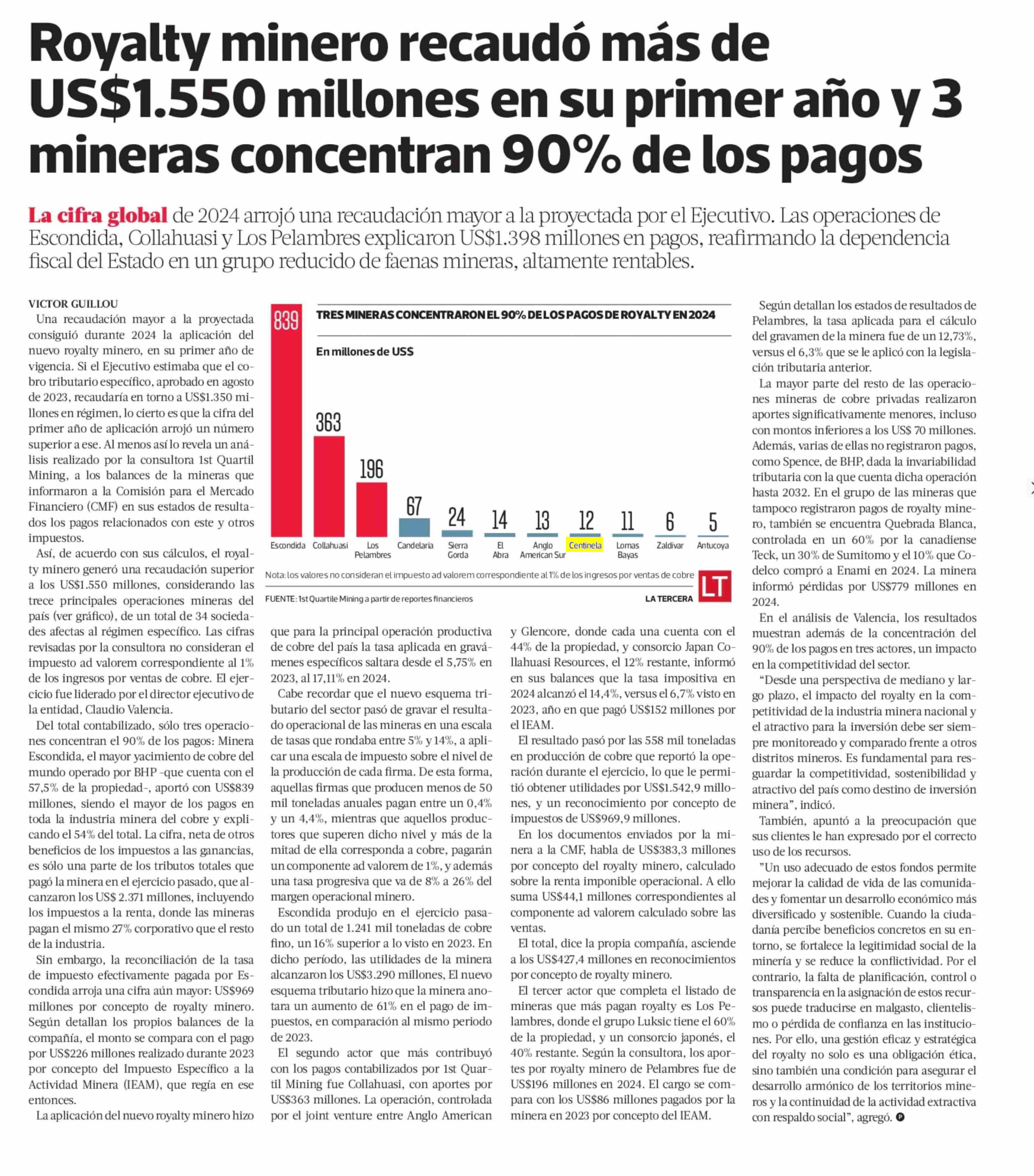 Título: Royalty minero recaudó más de US$1.550 millones en su primer año y 3 mineras concentran 90% de los pagos