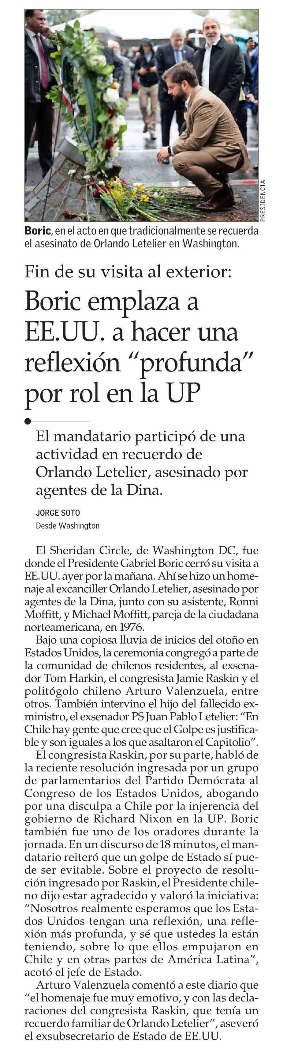 Boric emplaza a EE.UU. a hacer una reflexión "profunda" por rol en la UP