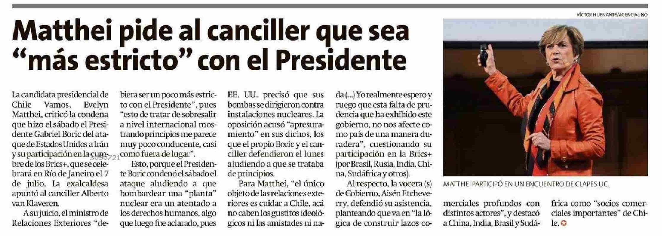 Matthei pide al canciller que sea "más estricto" con el Presidente