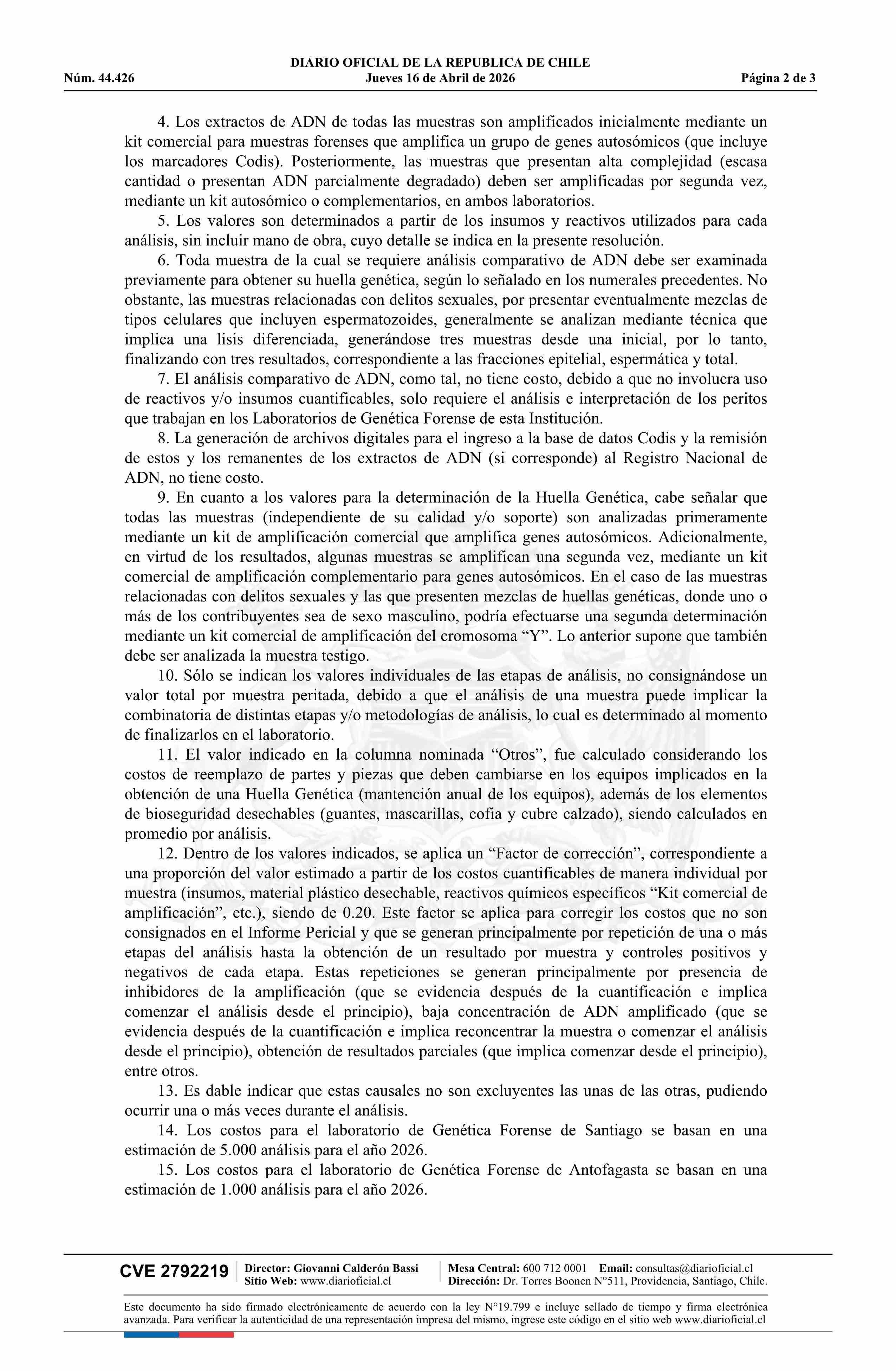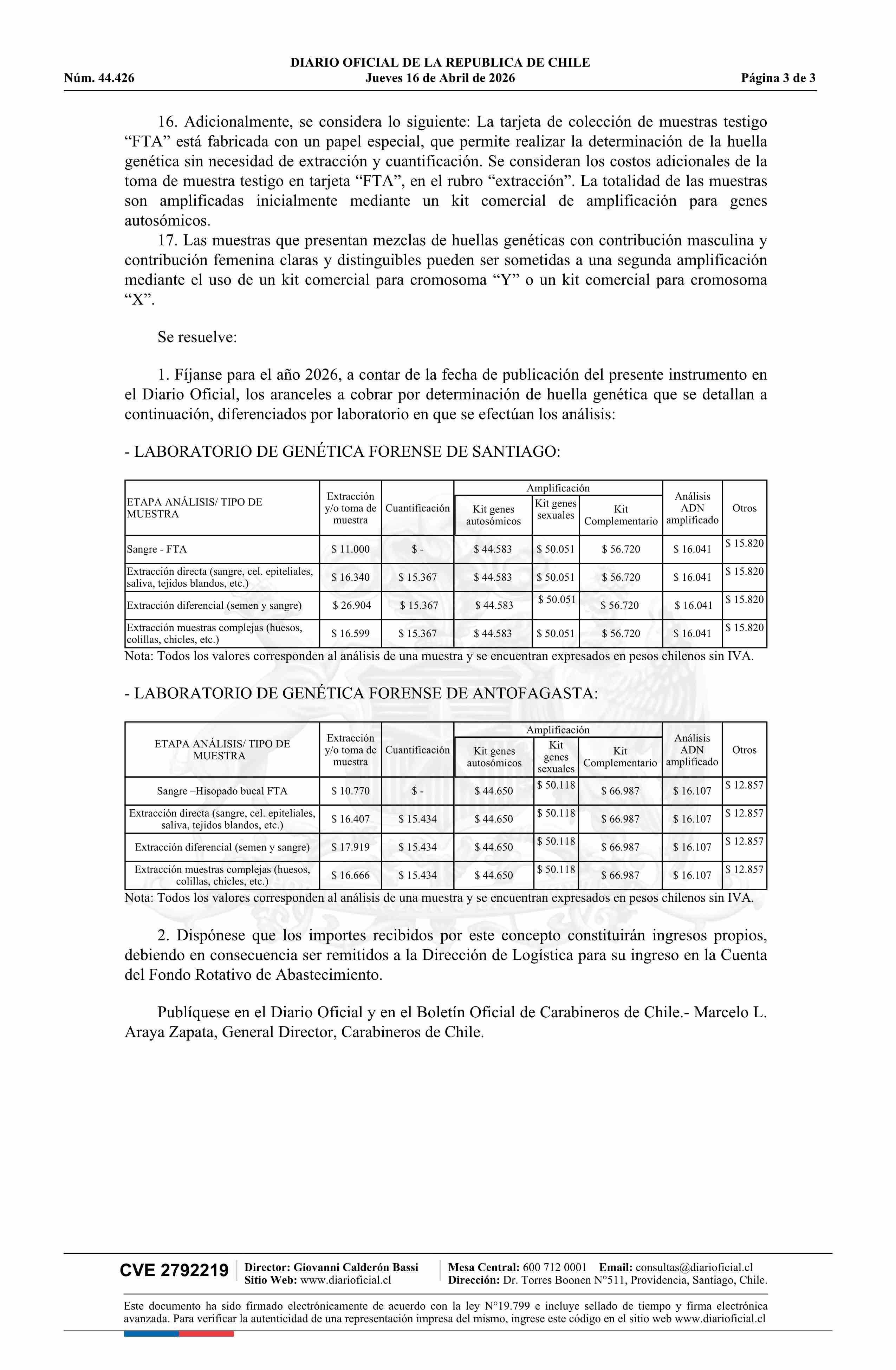 | Título: | Resolución exenta número 177, de 2026.- Fija aranceles a cobrar durante el año 2026 por determinación de huella genética y/o análisis comparativo de ADN |