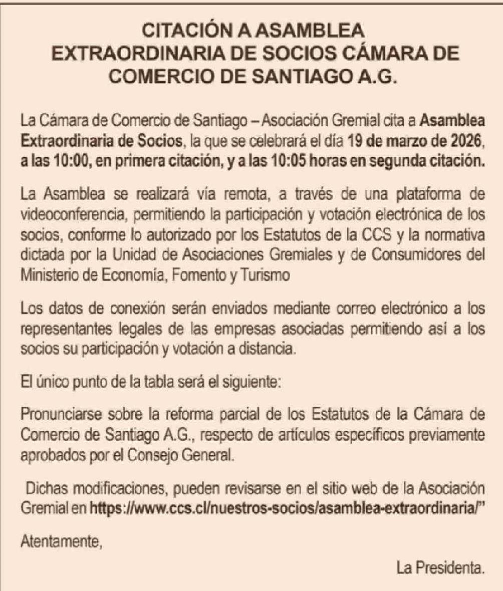 Extractos: CITACIÓN A ASAMBLEA EXTRAORDINARIA DE SOCIOS CÁMARA DE COMERCIO DE SANTIAGO A.G.