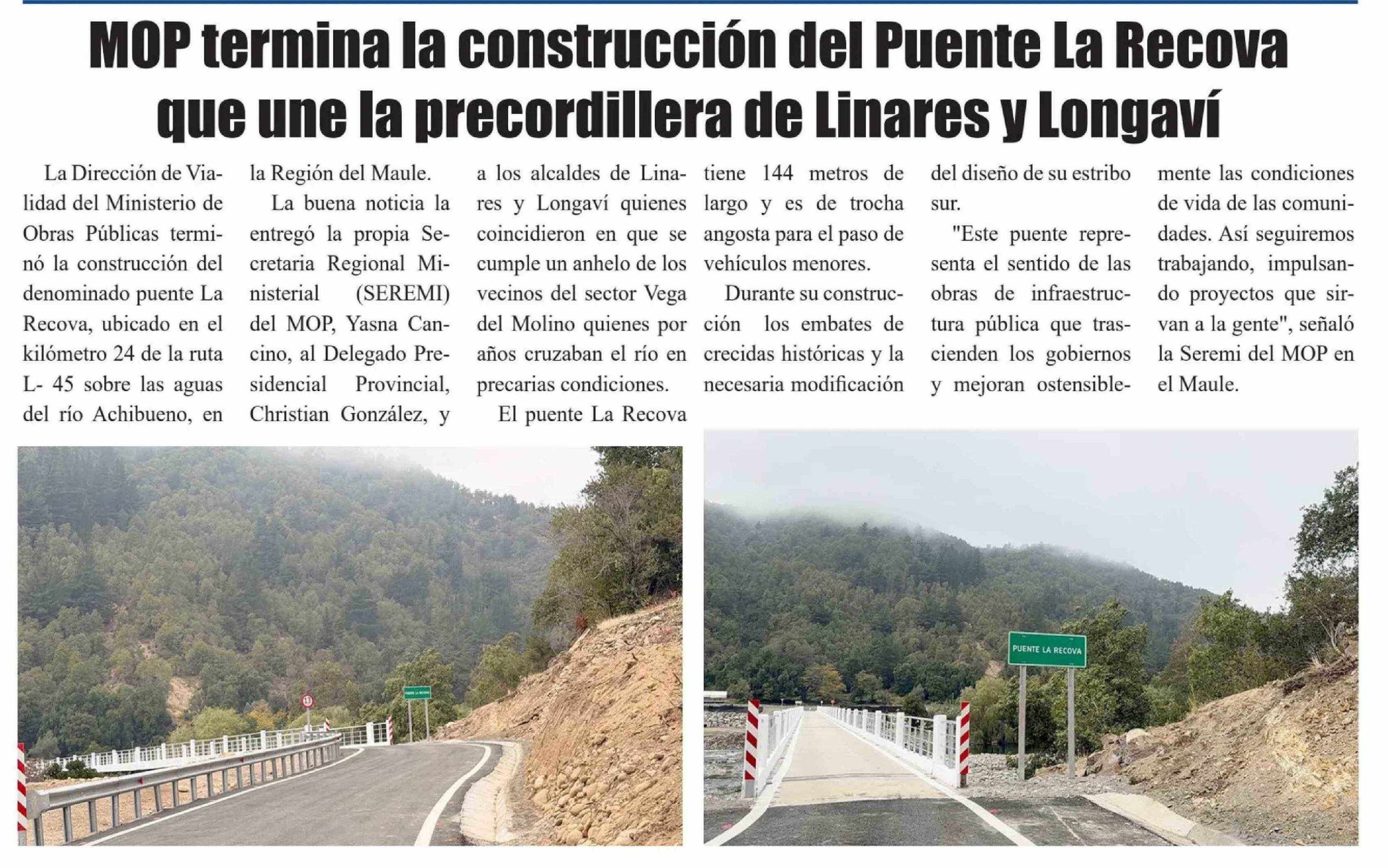 MOP termina la construcción del Puente La Recova que une la precordillera de Linares y Longaví