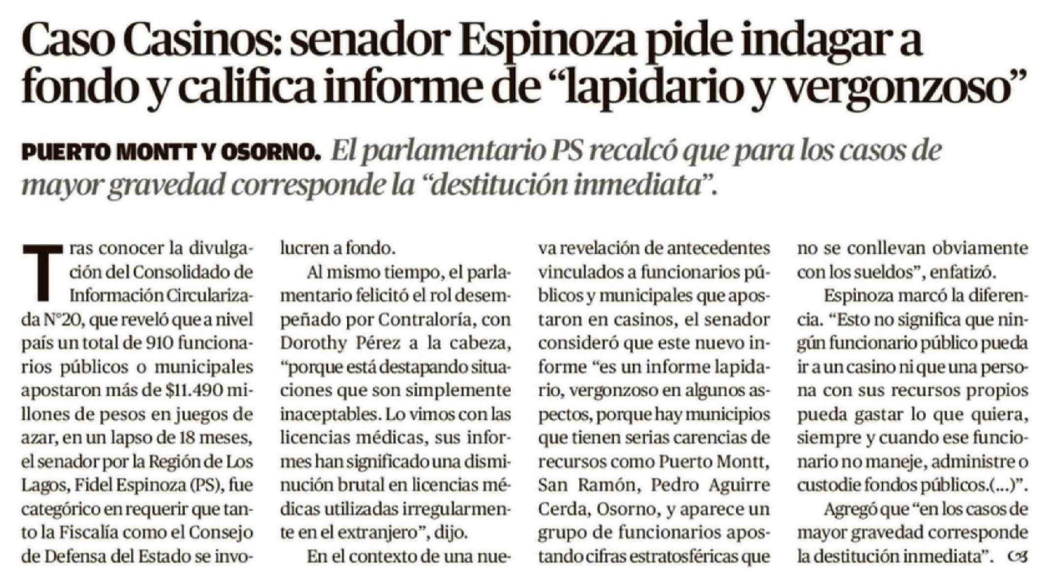 Caso Casinos: senador Espinoza pide indagar a fondo y califica informe de "lapidario y vergonzoso"