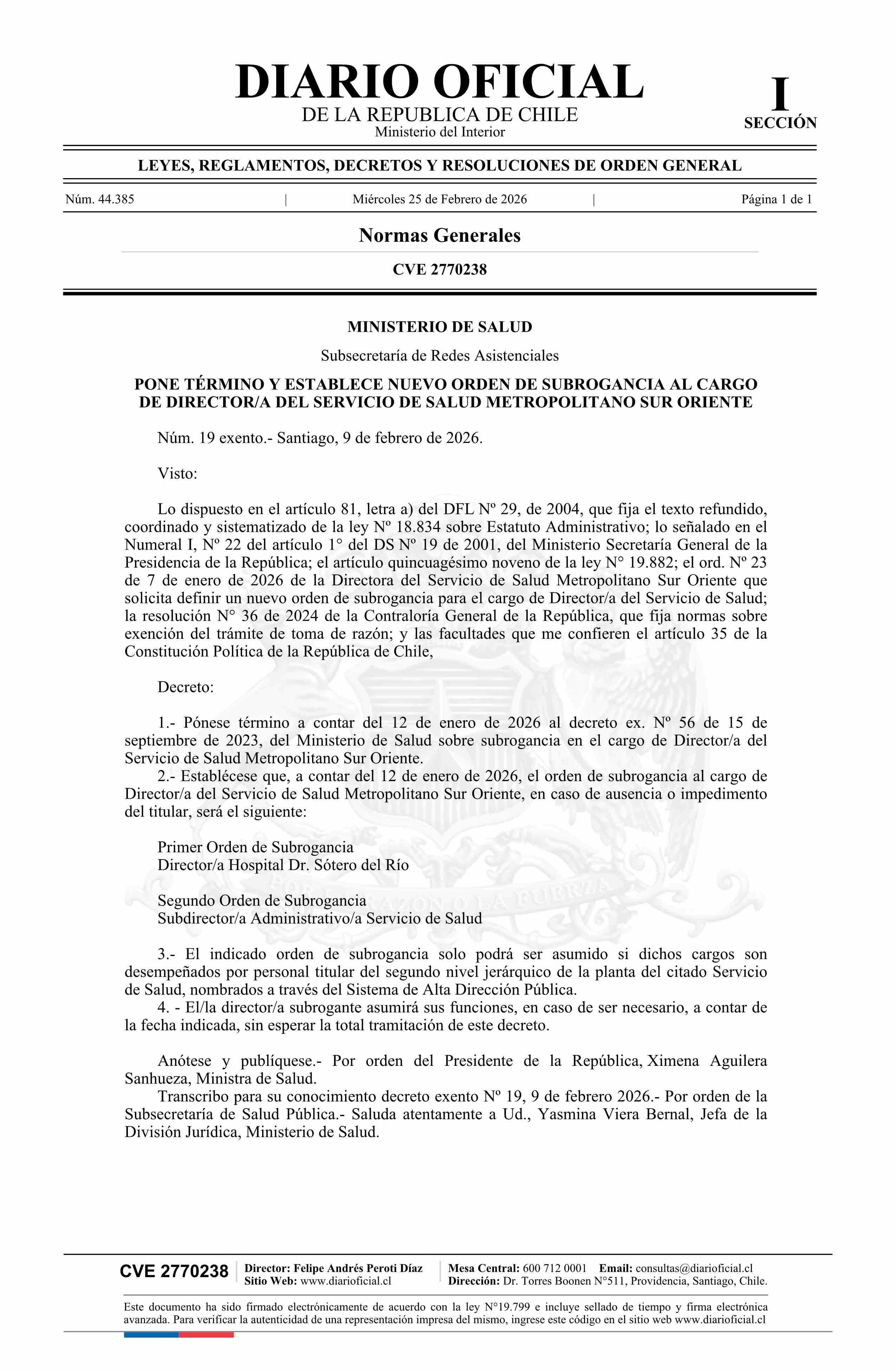 | Título: | Decreto exento número 19, de 2026.- Pone término y establece nuevo orden de subrogancia al cargo de Director/a del Servicio de Salud Metropolitano Sur Oriente |