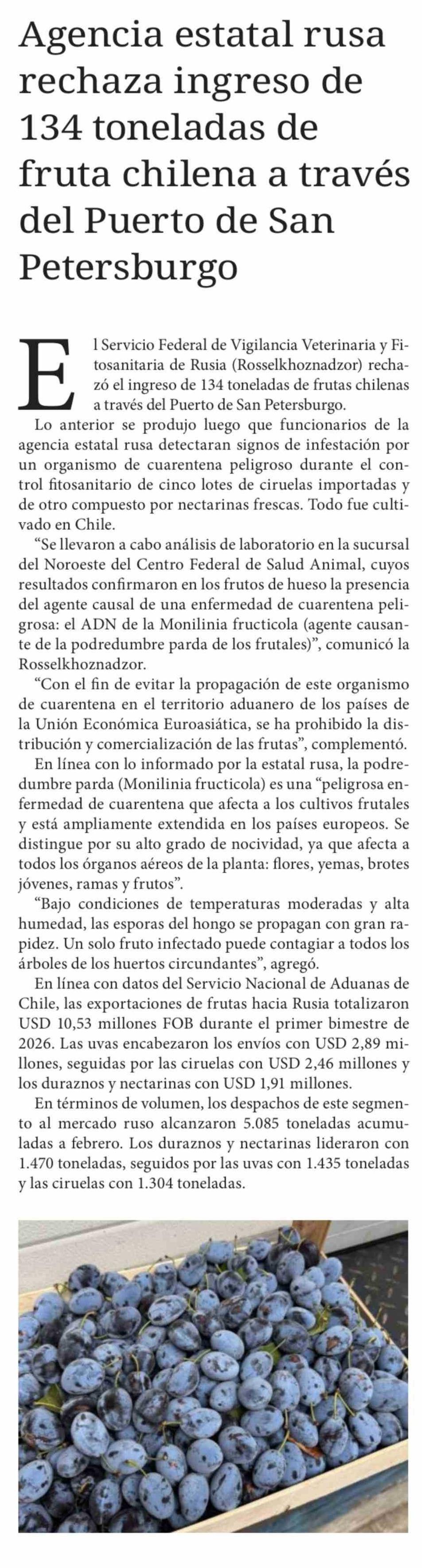 Agencia estatal rusa rechaza ingreso de 134 toneladas de fruta chilena a través del Puerto de San Petersburgo